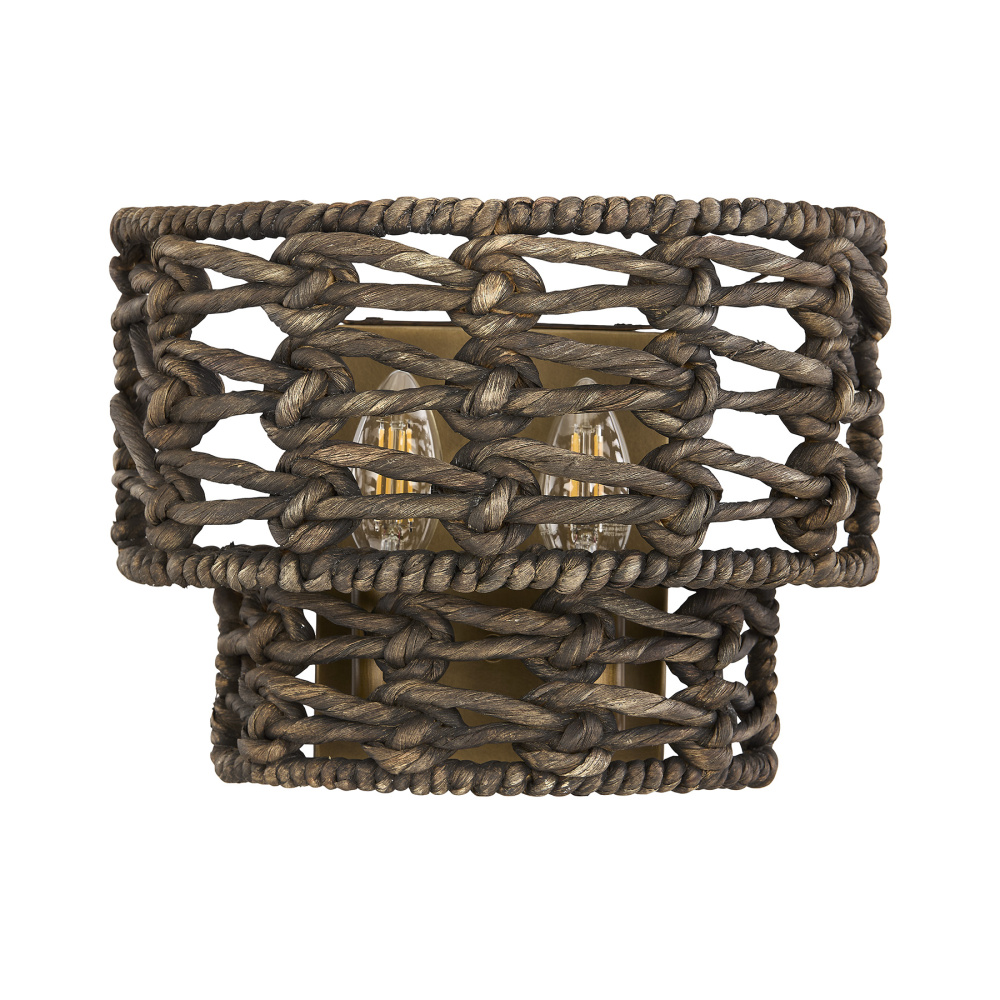 The Savoy House Silencio 2-light sconce was designed by Breegan Jane, an award-winning interior designer and TV host. Its textured, handwoven shades, crafted from natural water hyacinth, bring a soulful, artisan-crafted presence to any space. The knots and fibers catch the light in a way that feels serene, evocative, and grounded in nature. A Riviera Brass finish adds bold warmth that elevates the organic materials. Silencio is 8" in height, 11" in width and extends 5" from the wall. It uses two candelabra size bulbs of up to 60 watts per bulb. Bulbs not included. Damp area rated.