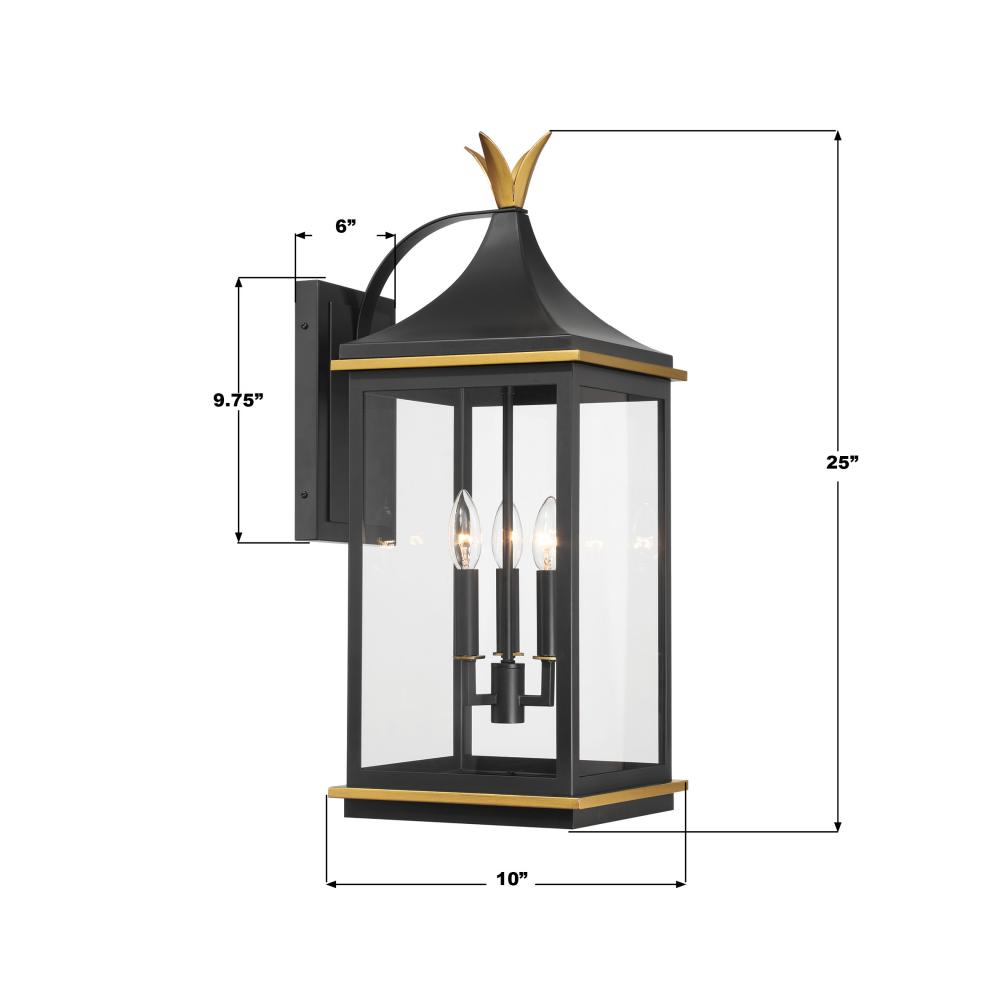 The Simpson Outdoor Collection features a lantern-style design with a two-tone finish. Its elongated rectangular frame, elegant glass panels, and candelabra bulbs create a classic look with a contemporary edge. The collection includes two options for customizing the top: a gold crown cap for a traditional flair or a sleek angled loop for a more contemporary appearance. This versatile design adds a stylish touch to any outdoor setting.