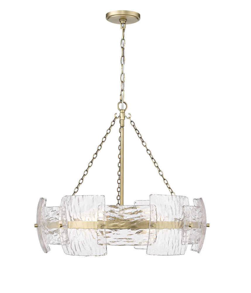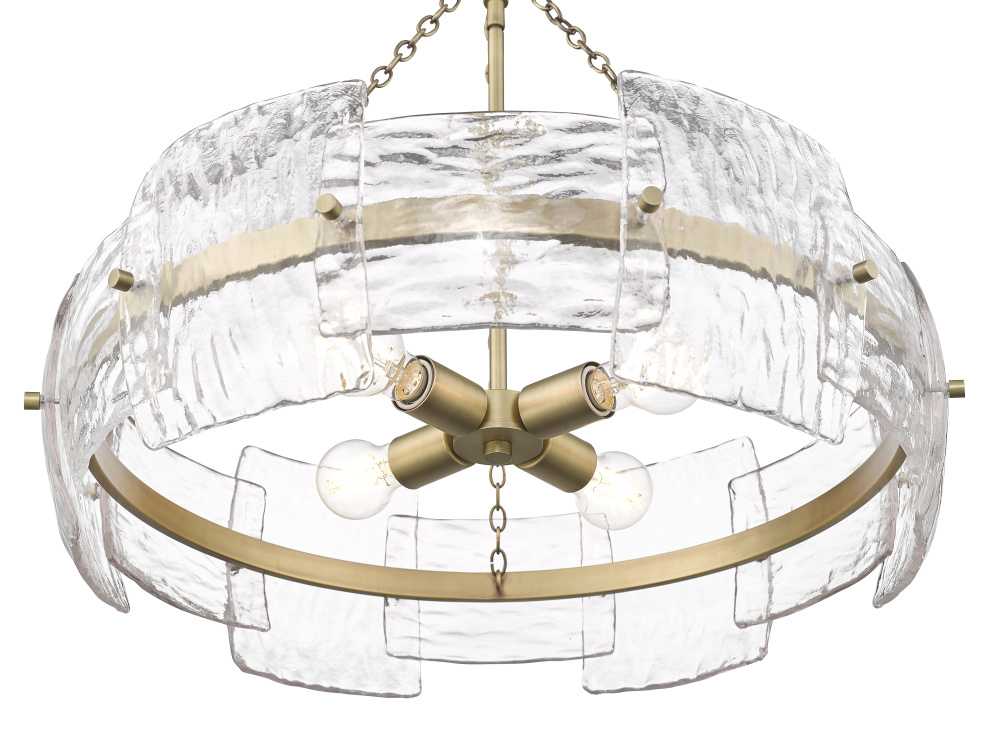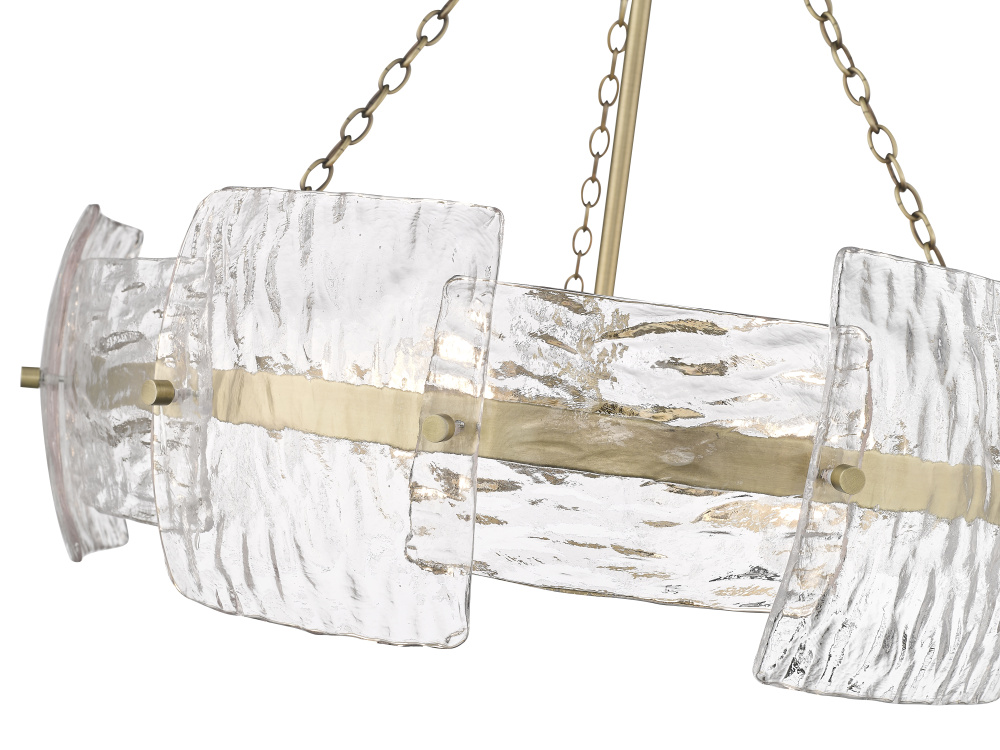 Delicate hammered glass panels create a dappled and diffused lighting effect and provides the Sinclara Family with a look of modern distinction. The gently curved panels feature rounded corners create a charming and organic profile suitable for any dining space, entry way or bedroom. The glistening panels are further enhanced by exquisite fixtures finished in vintage brass, adding a warm and inviting glow to these luxurious pieces.
