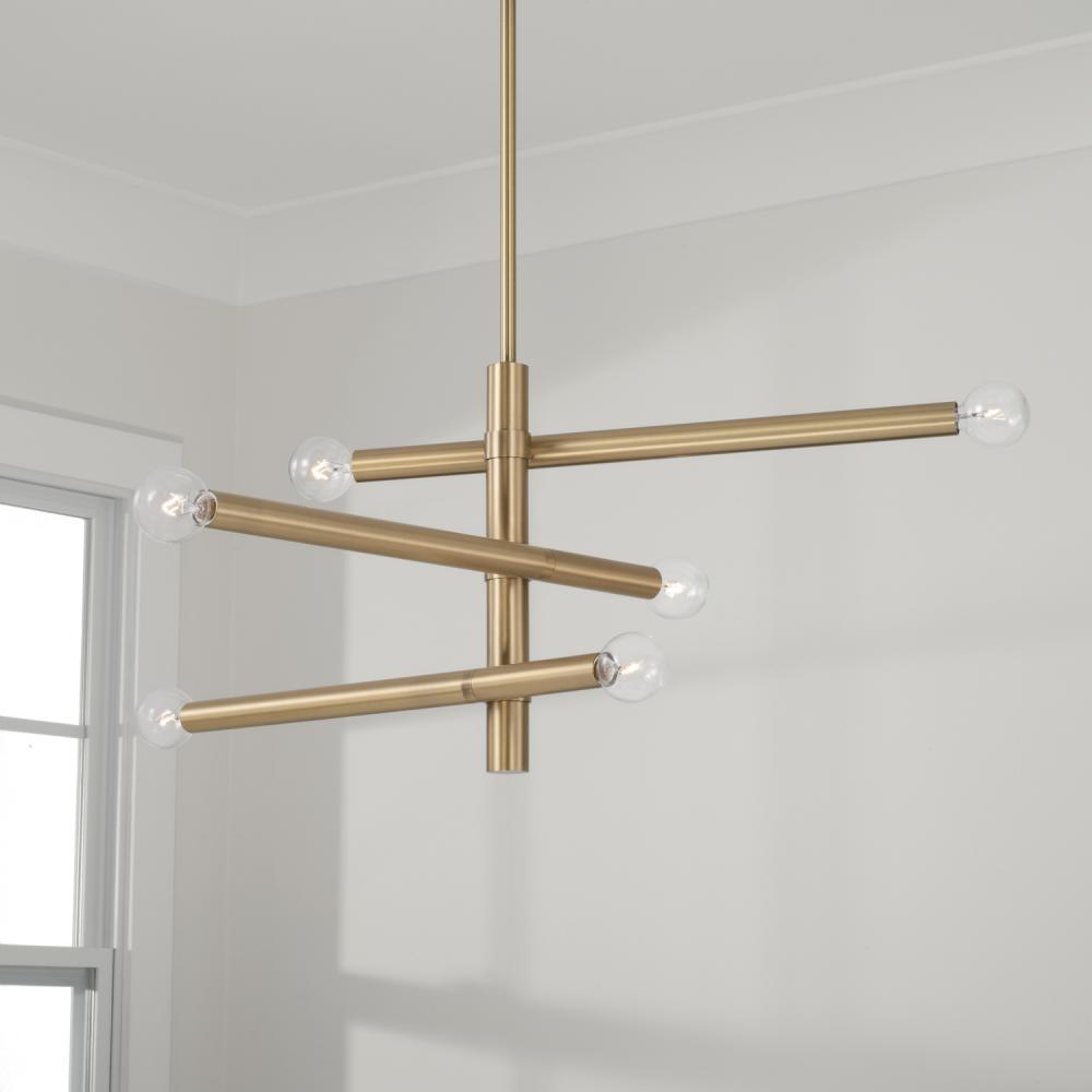 Defined by sleek lines and a modern form, the Zane Small Chandelier brings sophisticated sputnik style to any space. The warm tone of the Aged Brass finish gives this minimalist luminaire a nod to the mid-century aesthetic.