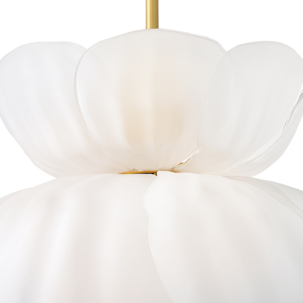 Fantine’s flowing blooms are inspired by preserved flowers suspended in time. Uniquely shaped artisan-sculpted glass arranged in lush layers creates an ethereal dance of light and shadow. An exaggerated canopy and slender stems are crafted from solid brass in a hand-touched Unlacquered Brass finish.