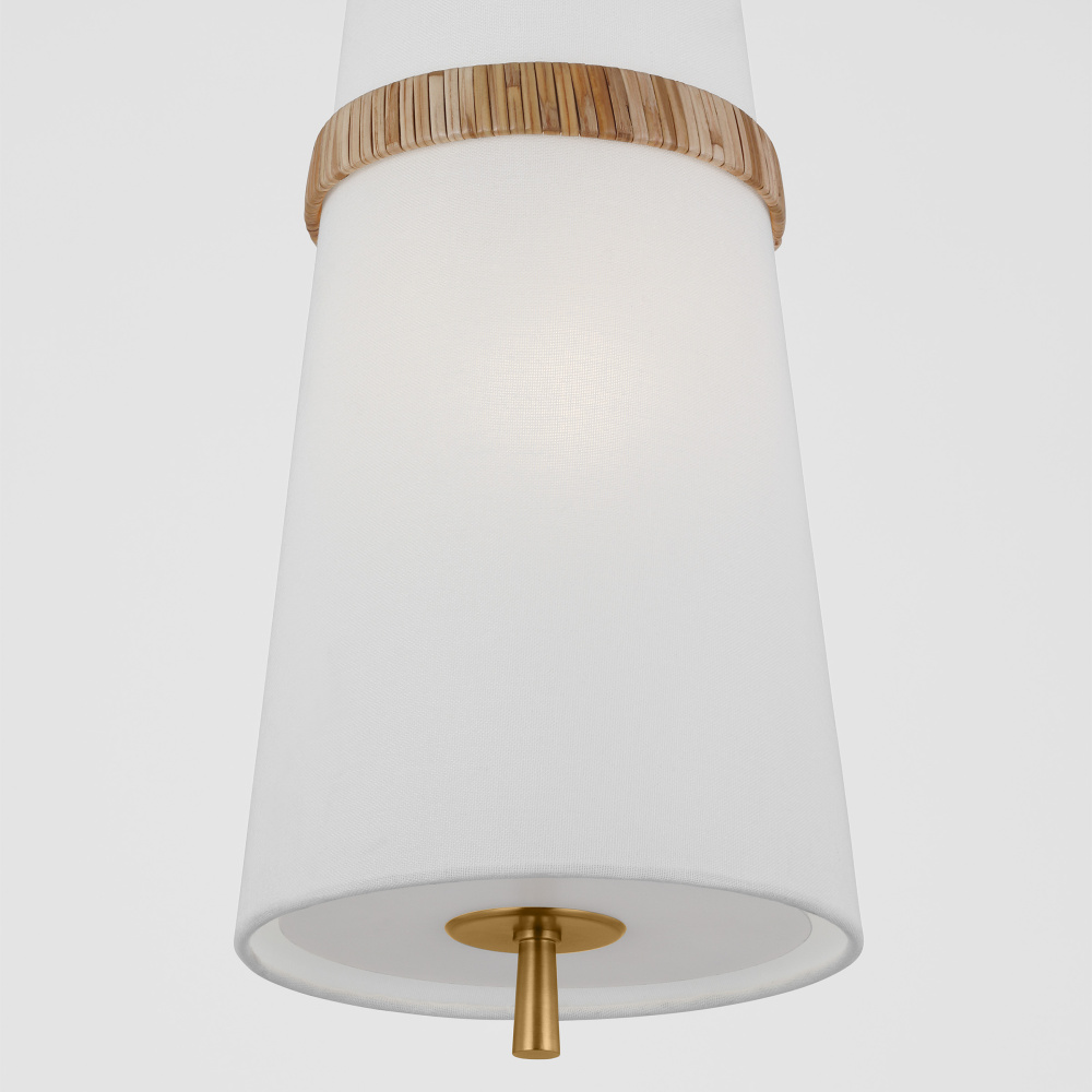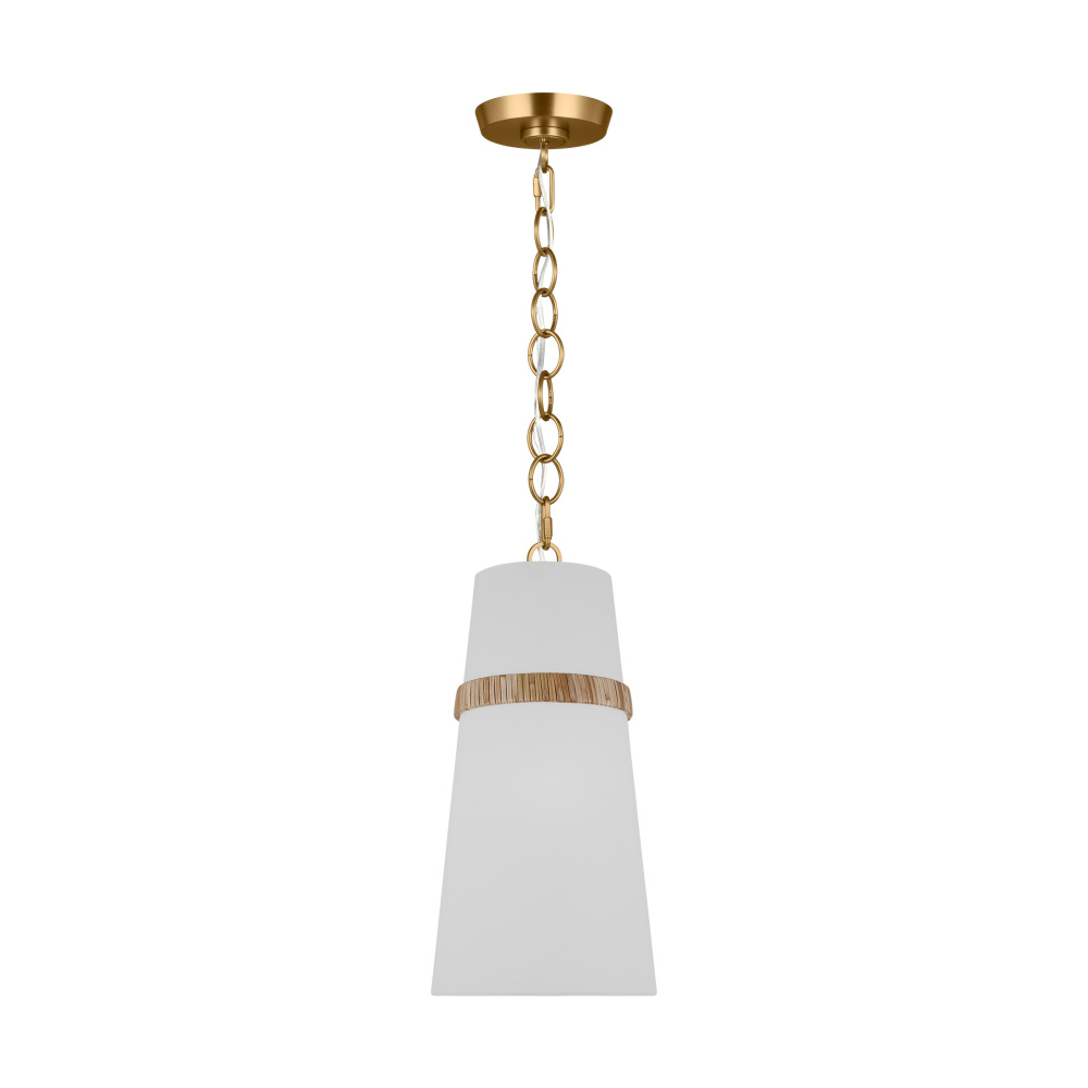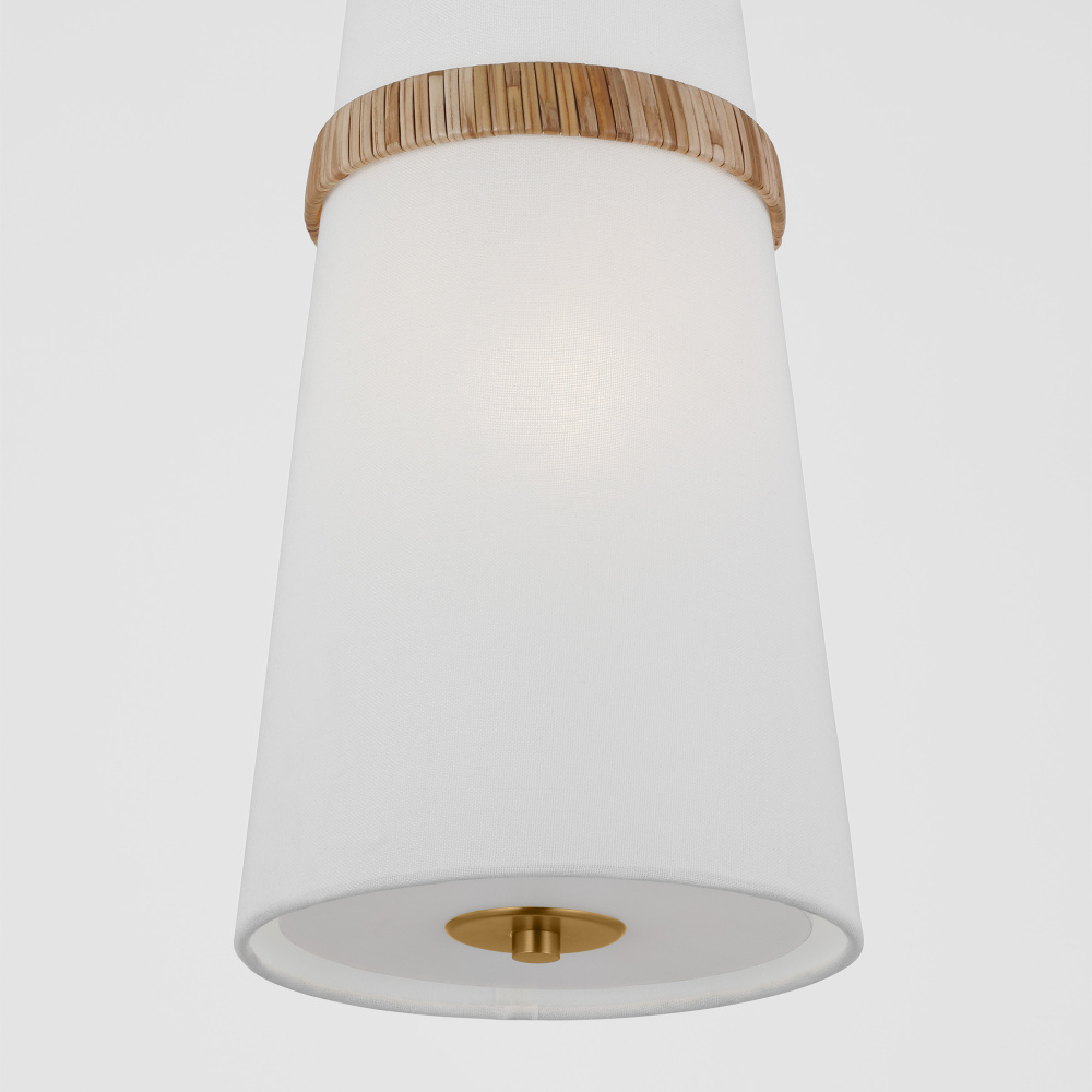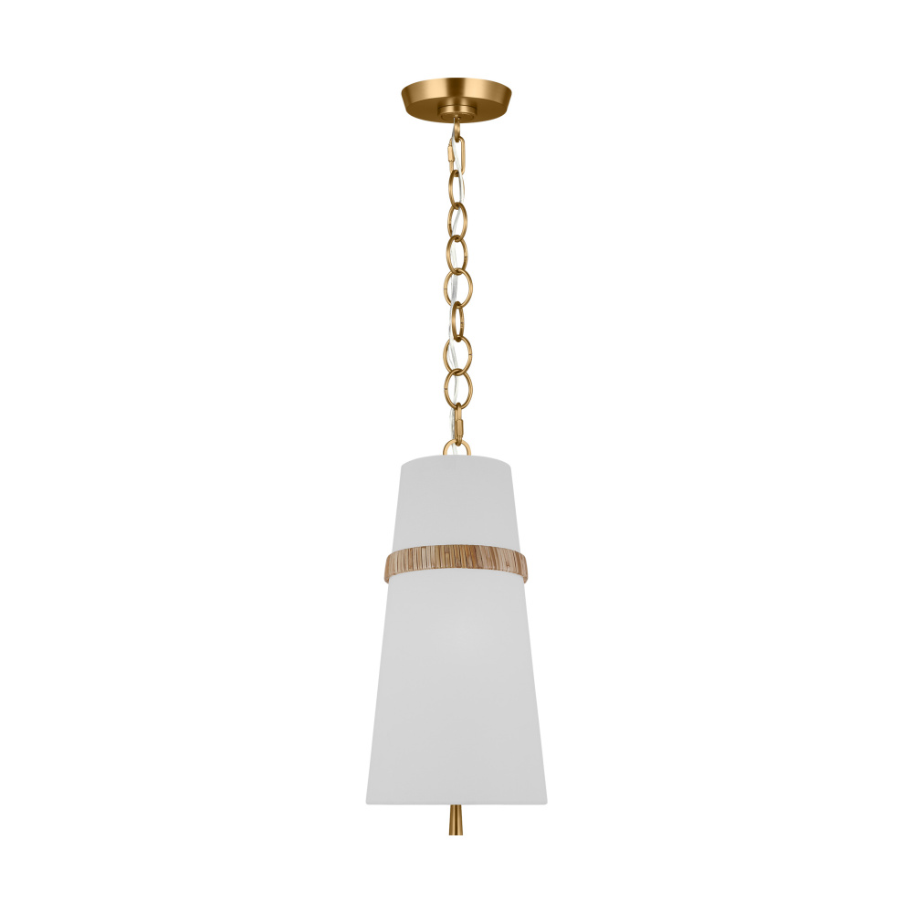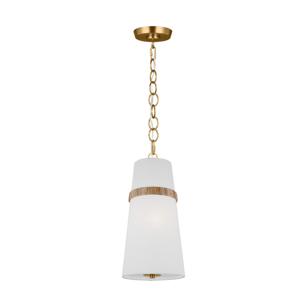 The Cordtlandt series by Alexa Hampton has a simple, purposeful design that makes it a perfect addition to any uptown chic décor. The cylinder-shaped pendant features etched glass diffuser, an over-scaled chain and a decorative end stem that ties the look together. Updated with a rattan woven ring detail elevates the design with a coastal vibe.