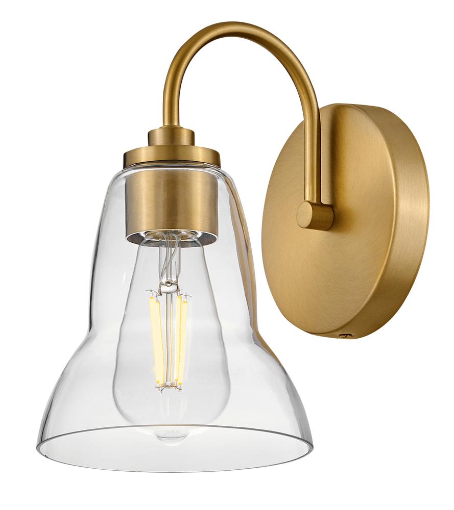 Vera’s unique, shapely form takes the traditional bell-shaped shades to a new level. Plenty of light shines up or down from the clear glass, making it a functional choice for main baths and powder rooms alike. Finished in Black or Lacquered Brass, Vera’s chic profile brings transitional style to any space.
