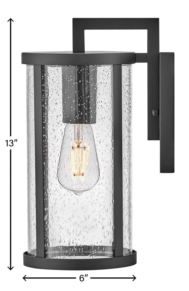 Alfie boosts curb appeal with effortless style. This transitional wall mount lantern features an easy-on-the-eyes cylindrical profile, bold Black metal frame and sizable clear seedy glass finessed to flatter any exterior. Pro tip: we recommend vintage filament bulbs to make Alfie really shine.