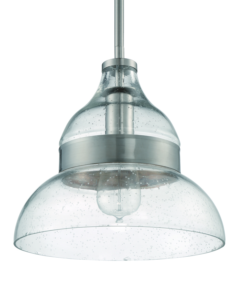 These rod hung clear seeded glass shade with brushed nickel or flat black metal band and canopy single light Smyth pendants capture the essence of style with the ability to customize the height and bulb up to 100W.