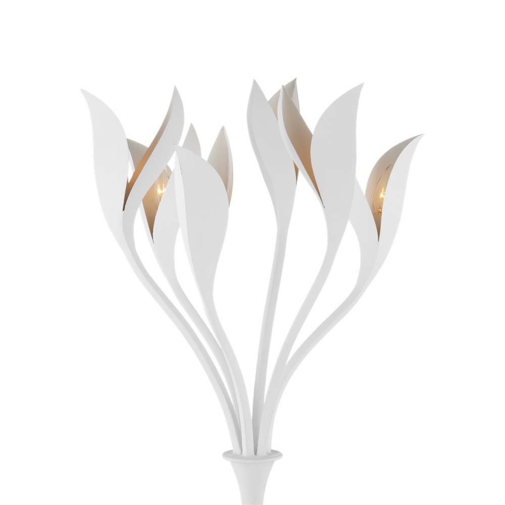 The big, beautiful blossoms of the Snowflower Floor Lamp and the body they flow up from are made of wrought iron in a gesso white finish. Unfolding toward the ceiling, the undulant petals direct the light upward. The pale finish that flows into the interiors of the blooms turns warm when the bulbs illuminate it. The white floor lamp with its wild botanical personality has a foot switch for ease of turning it off and on.