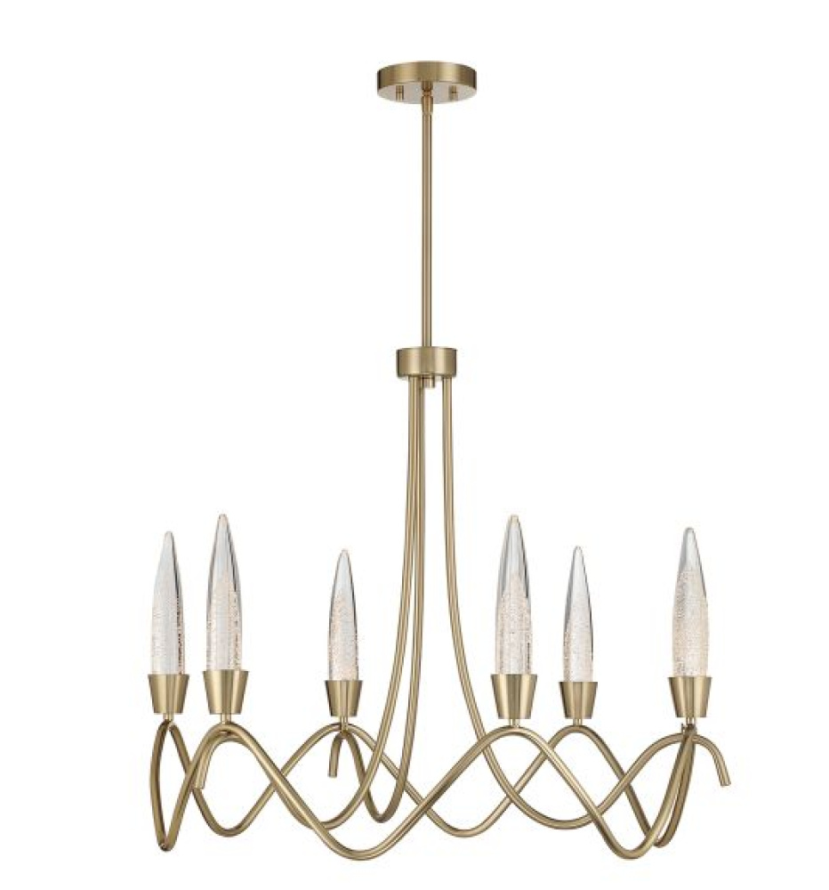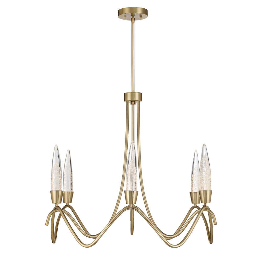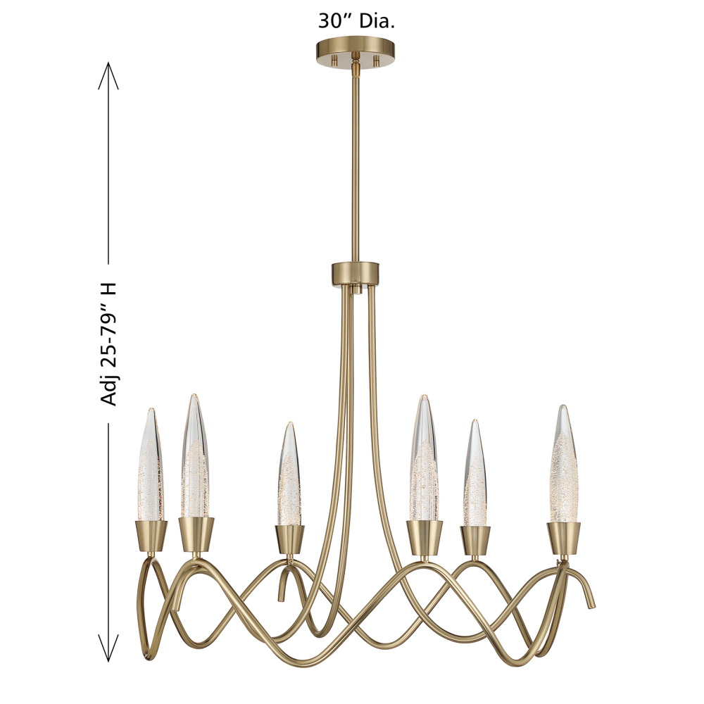 Striking and sculptural, the Savoy House Sofia 6-light chandelier turns illumination into art. Its open, undulating frame creates a sense of organic flow while pointed bubble glass accents glow with the soft shimmer of integrated LED. Finished in Noble Brass, it brings warmth and contemporary excitement to the room. This 30"-wide chandelier features an adjustable height ranging from 25" to 79" and includes four 12" downrods and one 6" downrod. It brings dramatic presence to smaller dining rooms, foyers, or intimate gathering spaces.