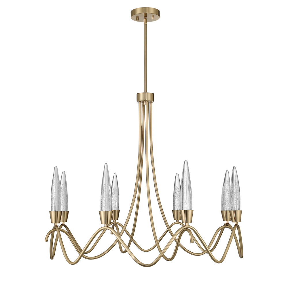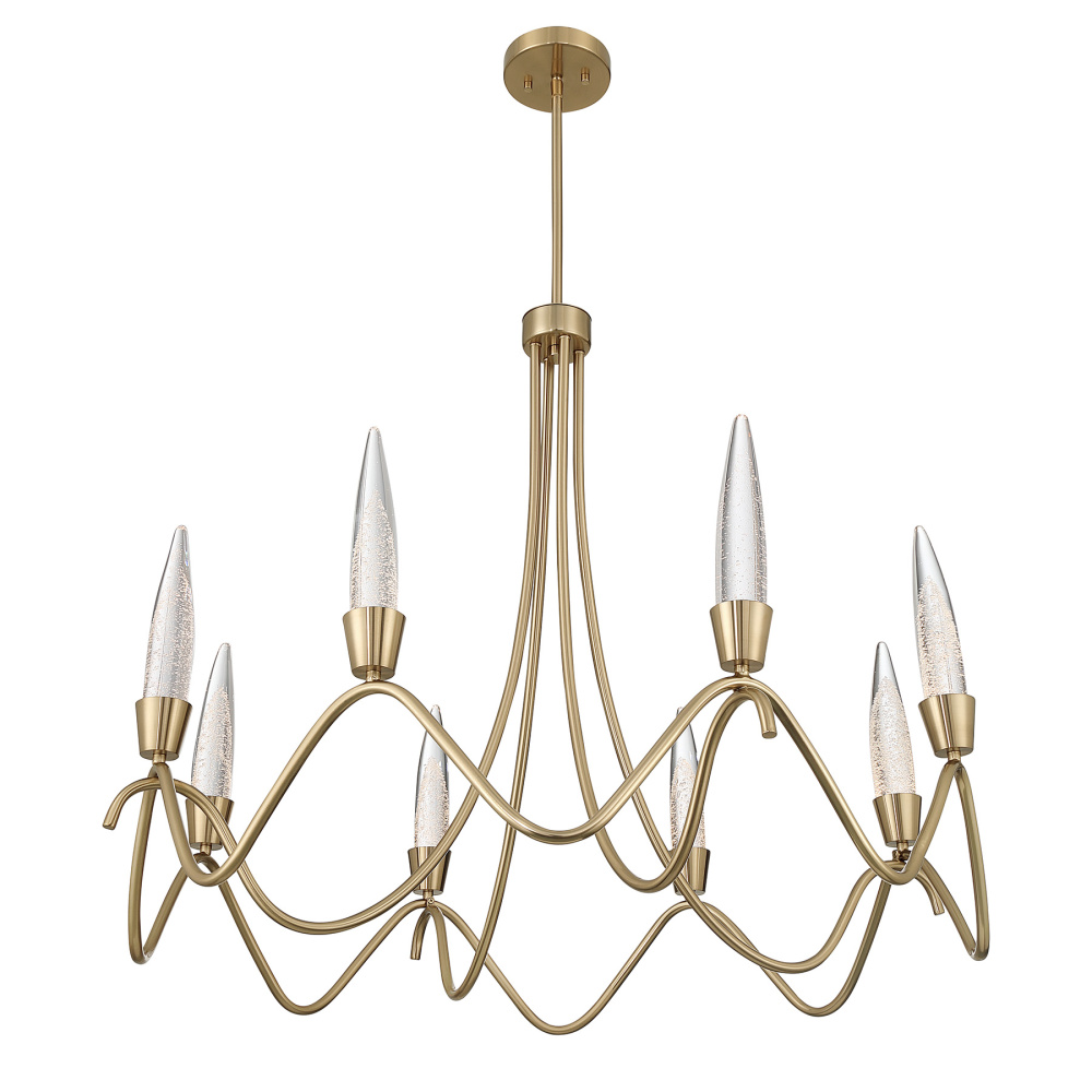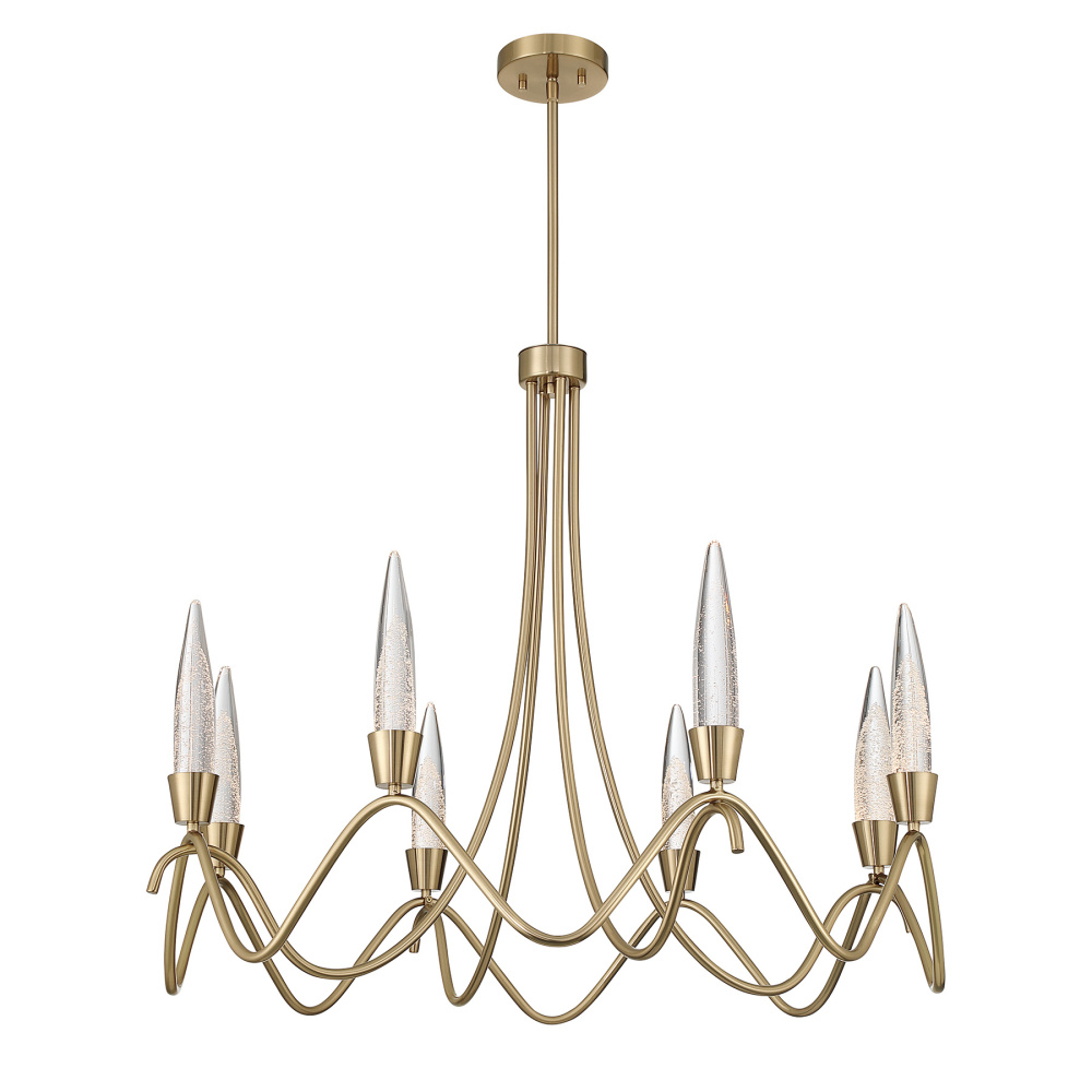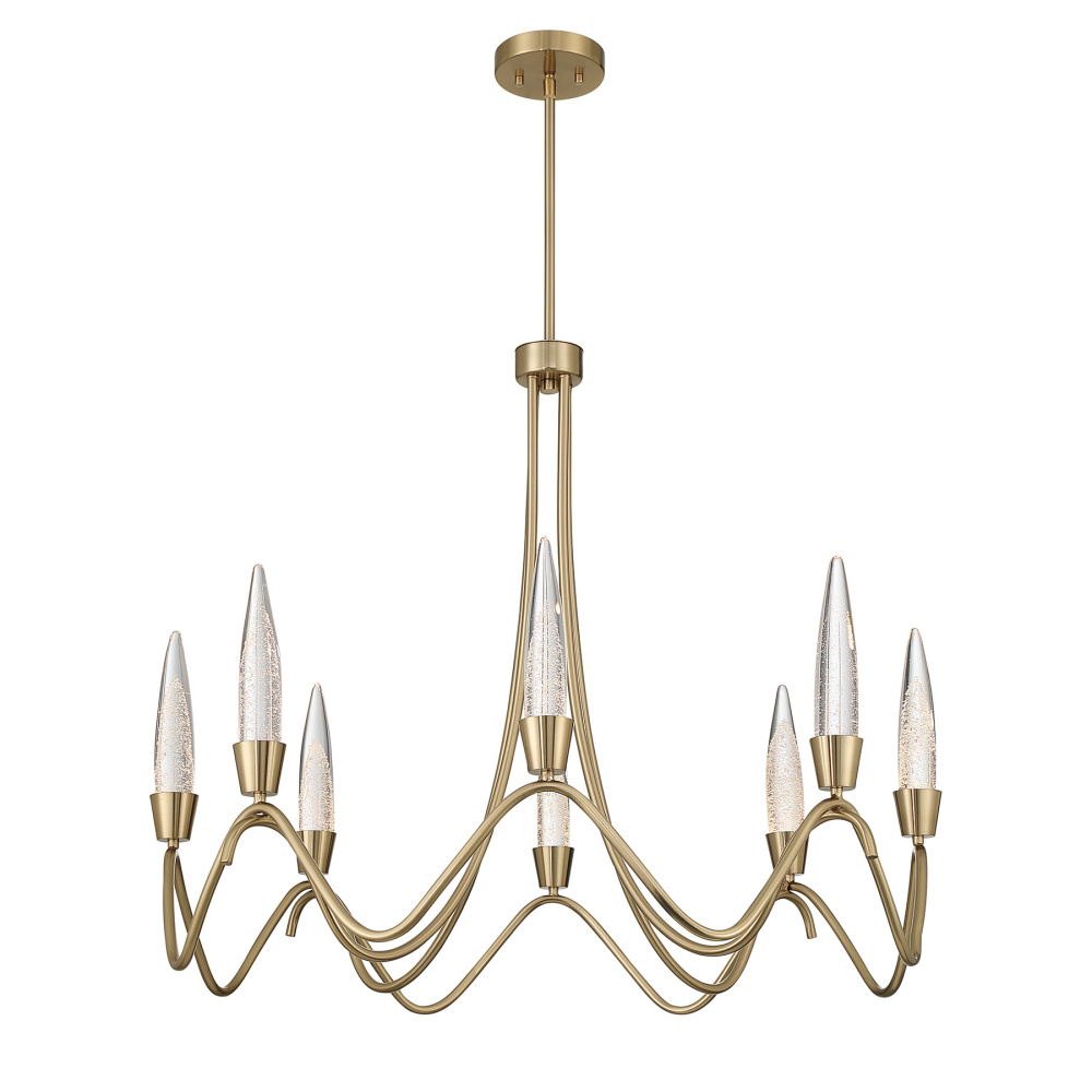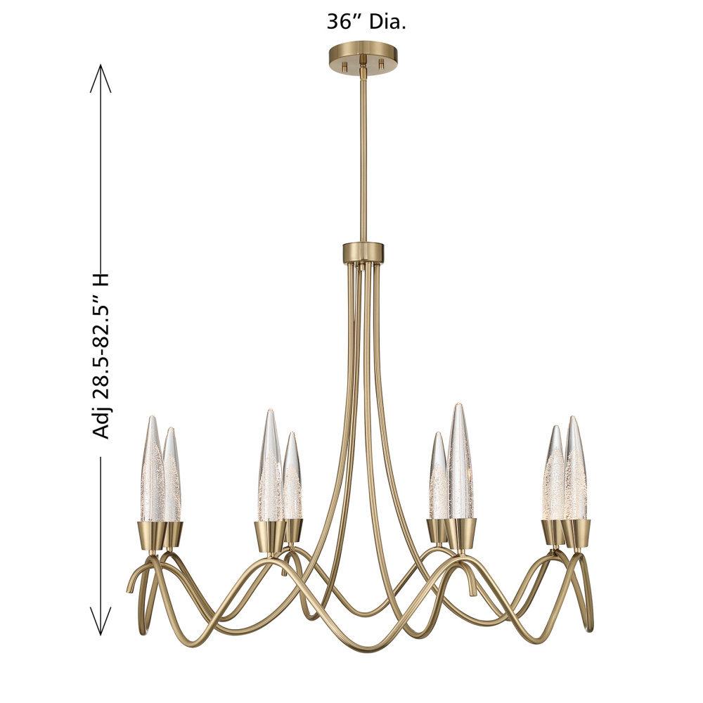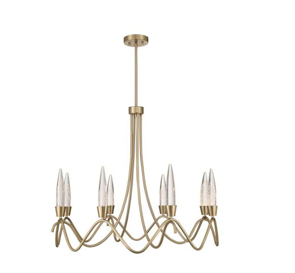 The Savoy House Sofia 8-light chandelier makes a stunning statement with its fluid, sculptural form. Waves of open metalwork create graceful movement around dramatic spears of bubble glass, each illuminated from within by integrated LED for brilliant sparkle. The Noble Brass finish amplifies the glow, giving the entire design a warm, contemporary radiance. Sofia is 36" wide and offers an adjustable height ranging from 28.5" to 82.5". It comes with four 12" downrods and one 6" downrod to help you achieve the perfect placement. A bold work of modern artistry, this chandelier brings energy and elegance to any space.