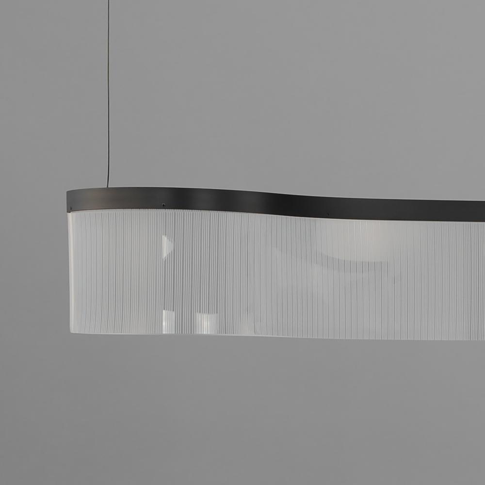 Composed of gently curving aluminum channels in Matte Black that supports a patterned translucent acrylic arranged in groups of vertical stripes, this series of pendants and coordinating ADA sconce expresses a musical quality in brilliant LED light. The wa