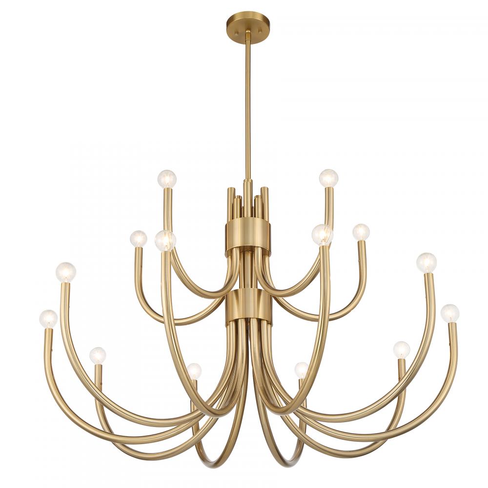 The Savoy House Sorrento 15-light chandelier is sure to stand out in any space! Two tiers of thick tubular arms curve upward and are each topped by an exposed light bulb. The fashionable Noble Brass finish looks great with every color or pattern. Sorrento is 42" in width and has an adjustable height ranging from 29" to 83". Comes with four 12" downrods and one 6" downrod. Uses fifteen candelabra size bulbs of up to 60 watts per bulb. Bulbs not included.