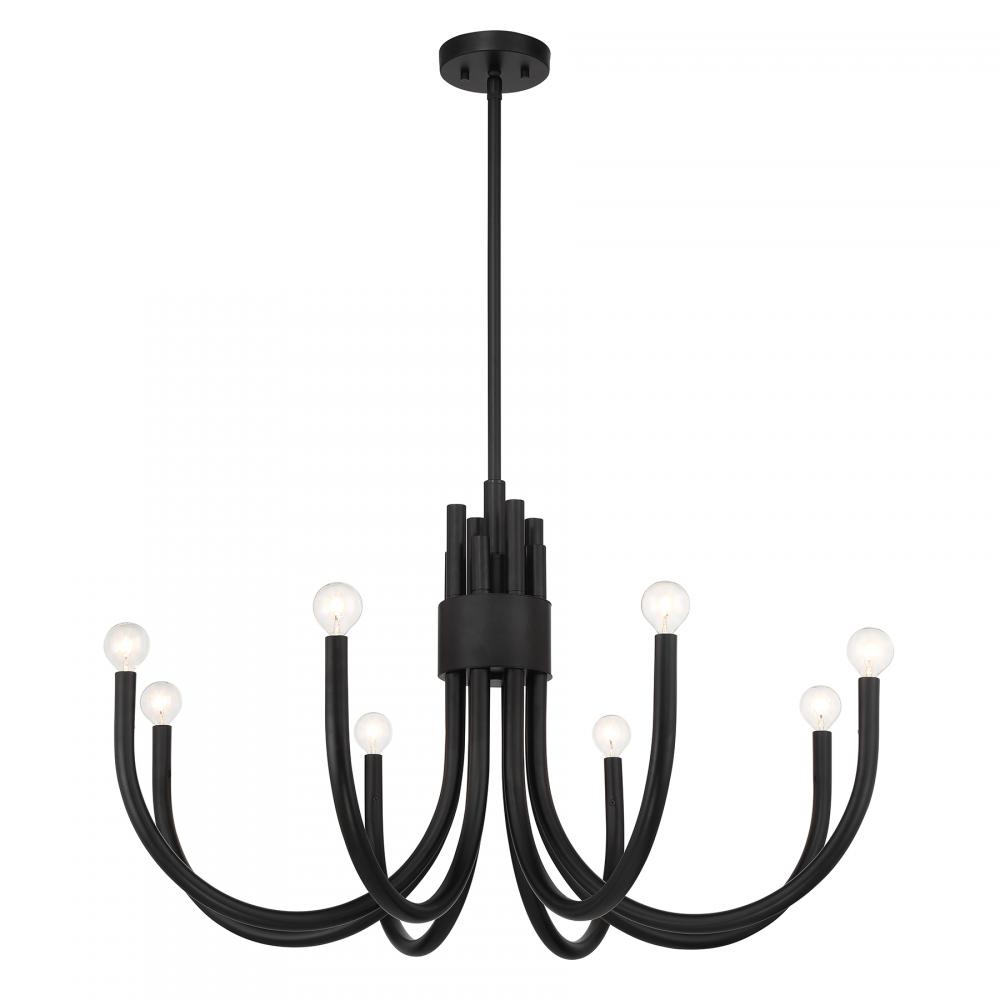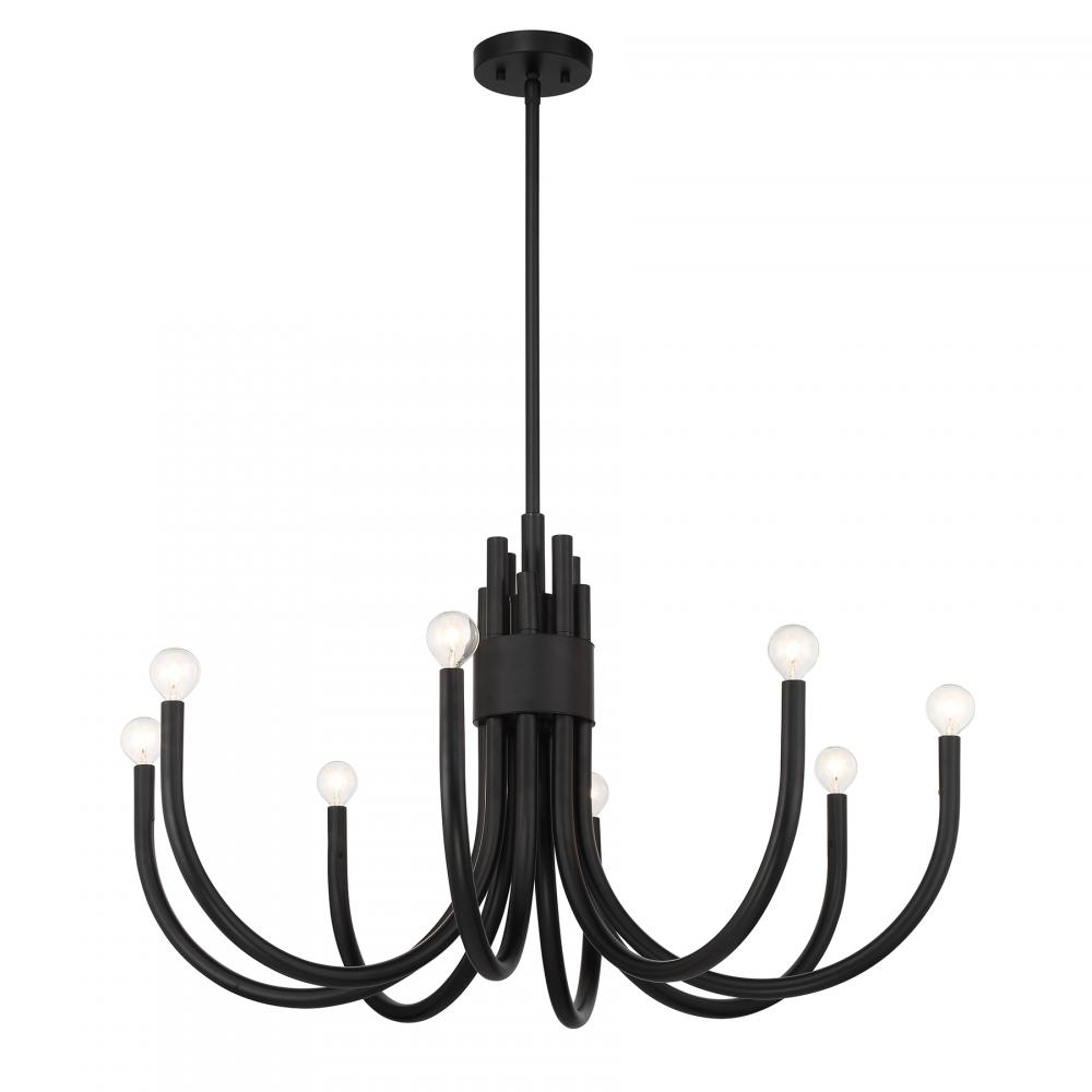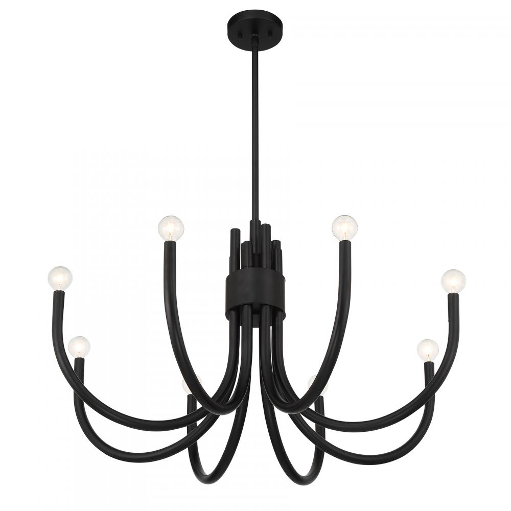 The Savoy House Sorrento 8-light chandelier is sure to stand out in any space! Thick tubular arms curve upward and are each topped by an exposed light bulb. The fashionable Matte Black finish looks great with every color or pattern. Sorrento is 34" in width and has an adjustable height ranging from 21" to 75". Comes with four 12" downrods and one 6" downrod. Uses eight candelabra size bulbs of up to 60 watts per bulb. Bulbs not included.