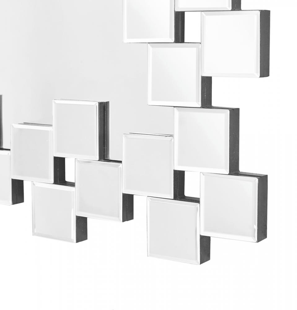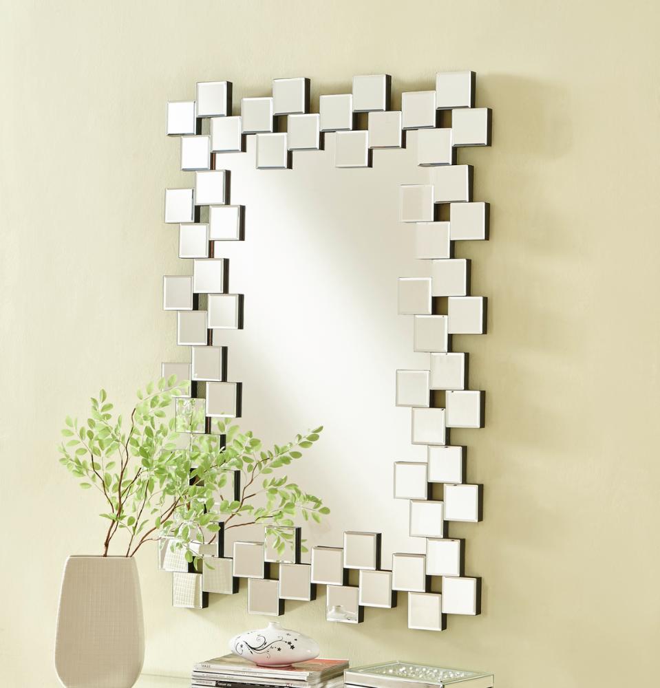 Make a striking statement in your home or office with this stunning contempo style clear mirror. Featuring dozens of expertly cut, beveled edge mirror pieces, layered together to create a bold, yet elegant textured look, you can adorn any promintnt wall with this dazzling contemporary mirror and be sure to catch people’s attention. · Contempo rectangle clear mirror · Mirrors and all surrounding panels are made with beveled edges