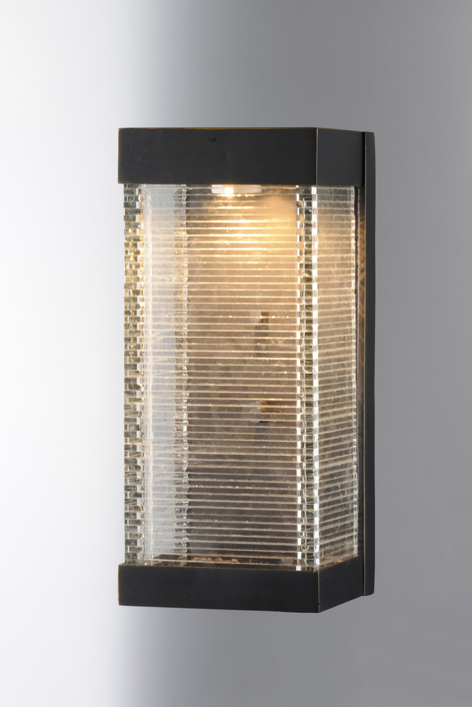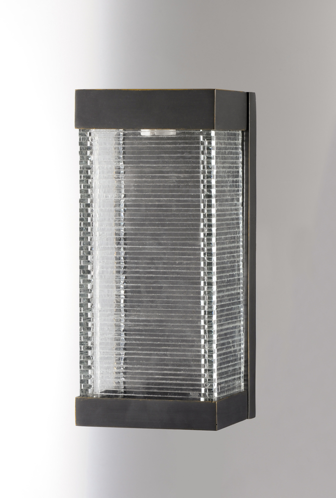 Layers of Clear panels of glass are stacked and fused to create an unusual outdoor design. Integrated LED mounted on the inner Bronze finished hood shed light down the sides of the glass creating an interesting lighting effect.
