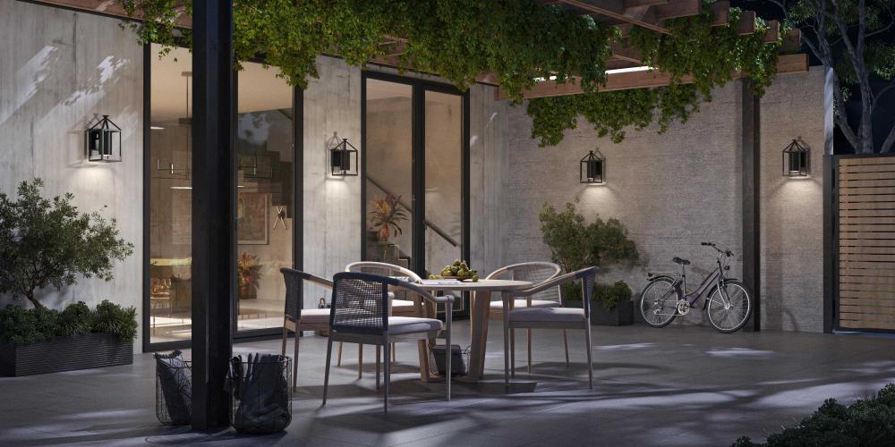 The minimalist Stallworth wall lantern projects a wash of warm downlight, making it perfect porches, patios and other outdoor spaces