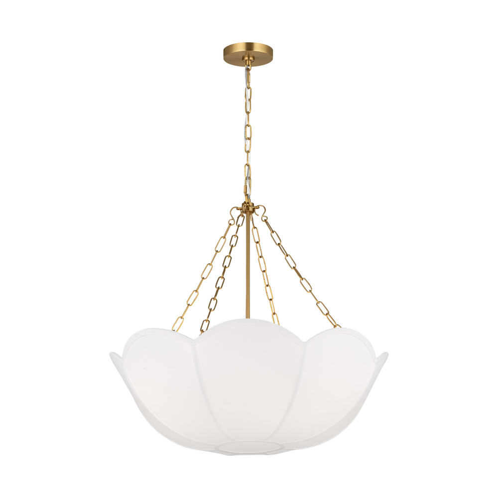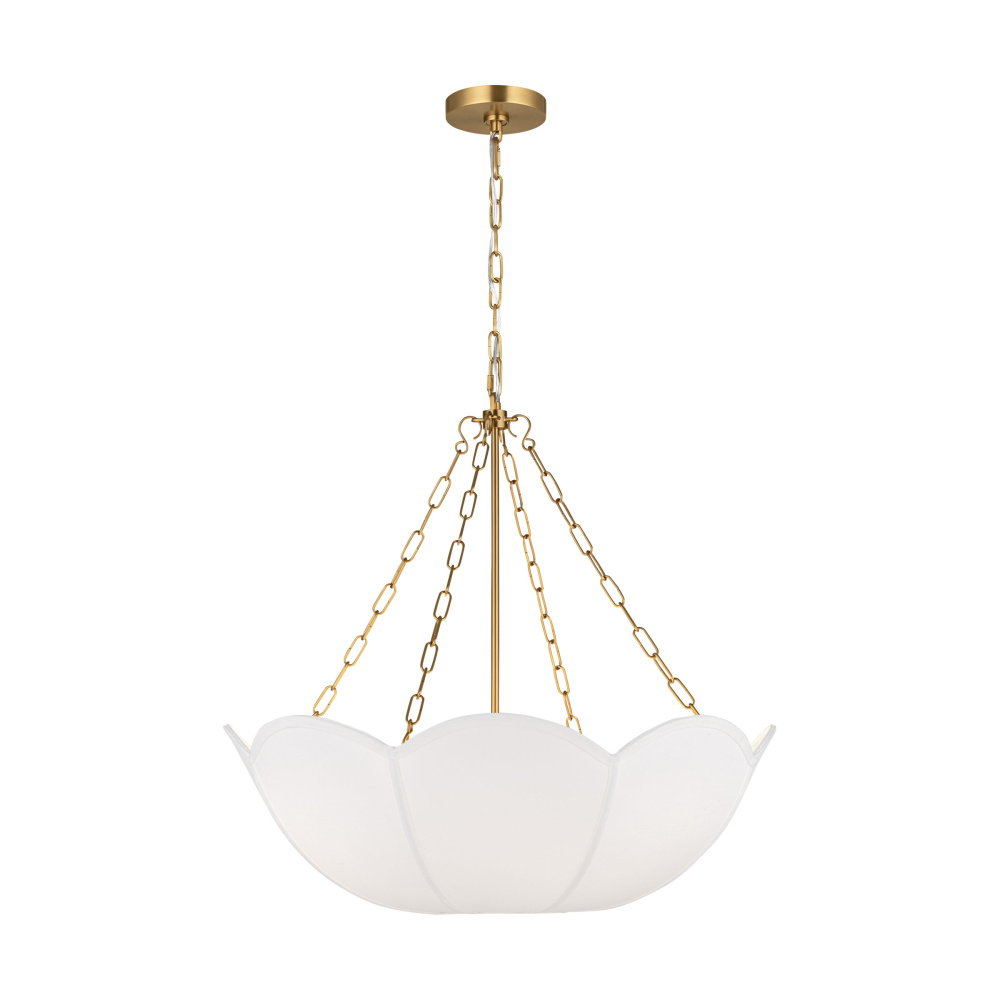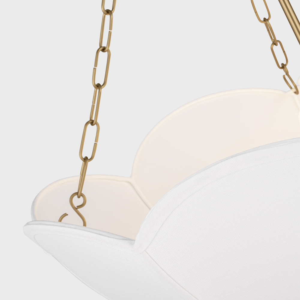 Reminiscent of a spring tulip, the Stassi series by Alexa Hampton updates Art Nouveau inspiration with a modern aesthetic. The scalloped basket silhouette is completed by the contrast of metal chain and white linen. The chandelier will create a harmonious statement hanging in a living room, dining room or bedroom.