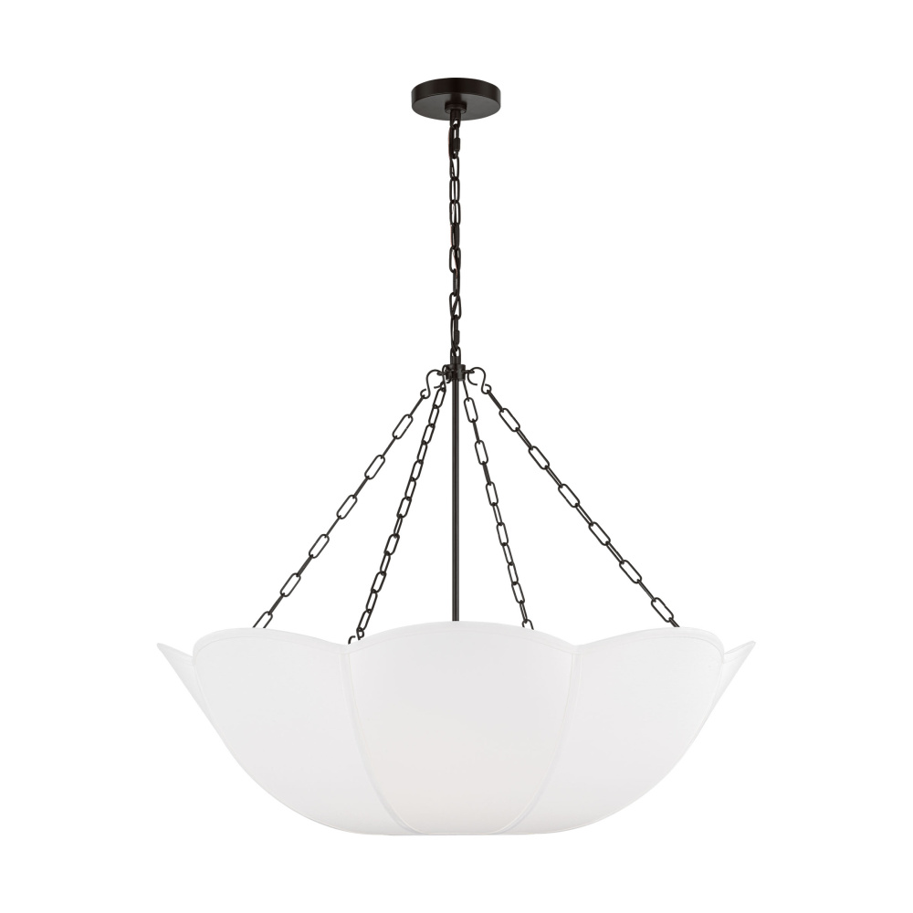 Reminiscent of a spring tulip, the Stassi series by Alexa Hampton updates Art Nouveau inspiration with a modern aesthetic. The scalloped basket silhouette is completed by the contrast of metal chain and white linen. The chandelier will create a harmonious statement hanging in a living room, dining room or bedroom.