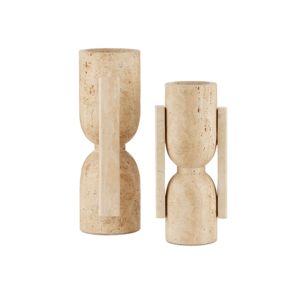 The Stone Vase, Face to Face Set includes two modern iterations of brutalist sculptures made of hand-carved travertine. The geometric vessels are solid on the bottom and hollowed out on top to create a vase-like opening. They are not meant for floral arrangements, as they are not watertight. Note that the texture will vary from piece to piece.
