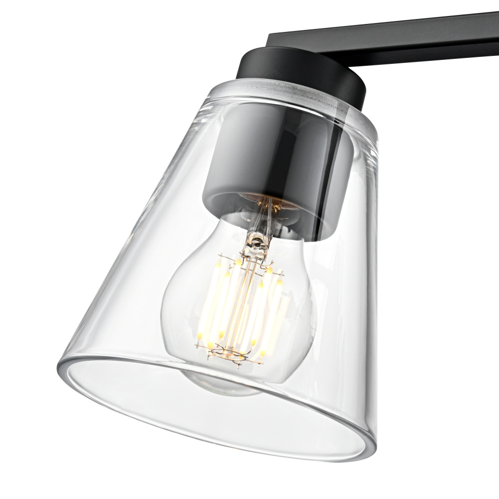 This fixture features a matte black finish and clear glass shade.