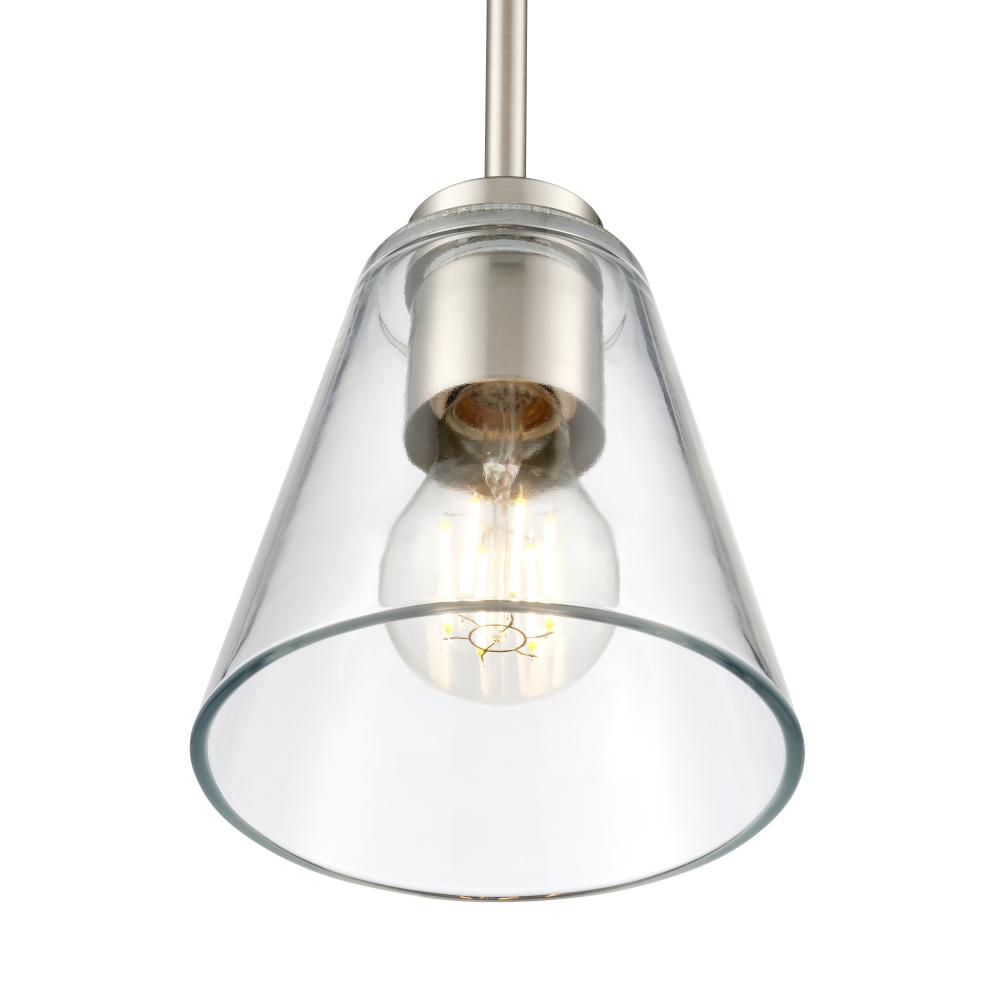 This fixture features a brushed nickel finish and clear glass shade.