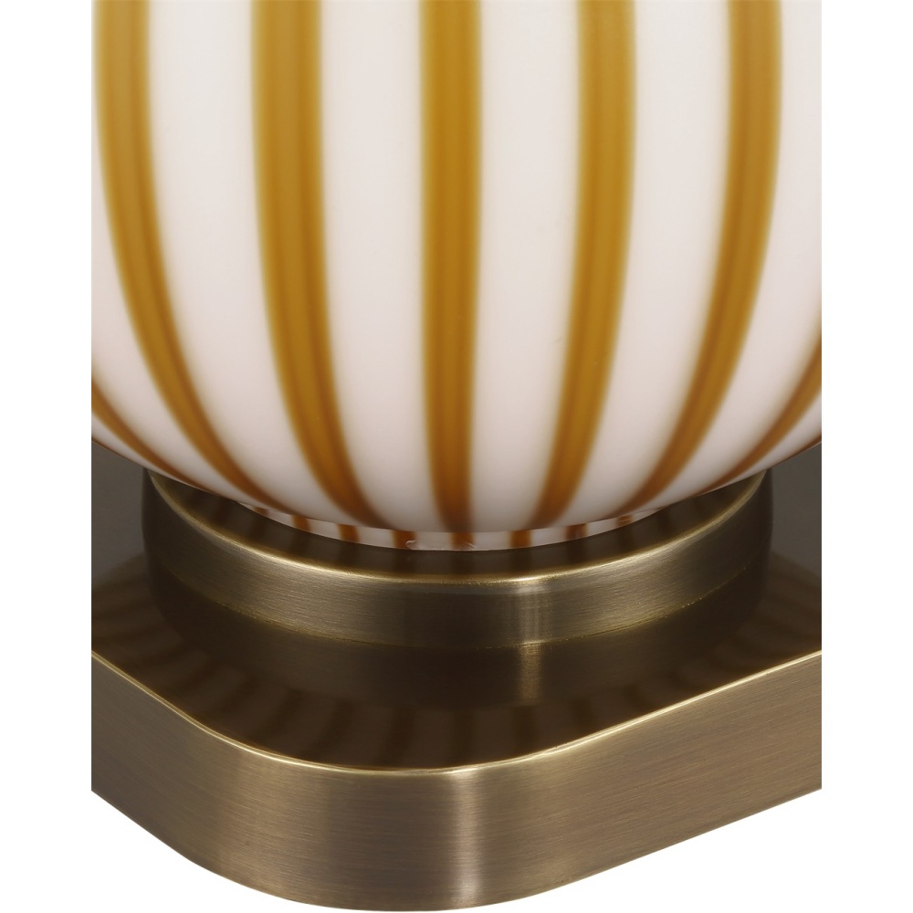 The Striae Table Lamp was created during a meticulous two-step glassmaking process in which evenly spaced ochre glass rods are fused onto a white milk-glass body to create a striated pattern. The flared empire shade echoes the lamp’s pale tones while the antique brass base and finial draw out the rich ochres. The design, which was inspired by an Italian fixture, is very difficult to achieve with such uniformity.