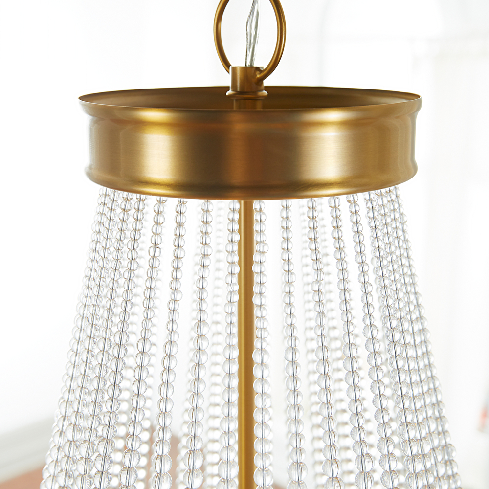 The architectural molding inspired stepped metal frame of the Summerhill collection supports strands of graduated polished clear crystal beads. Designed with two differing profiles - either the full traditional Empire silhouette or in the half basket – both lit from within to cast a shimmering light through the crystal draping. The half basket chandeliers have a traditional candelabra while the full Empire chandeliers have a flat multi-light cluster level with the lower metal band to provide an inconspicuous light source. Each light is capped at the bottom by a unique faceted crystal disc.