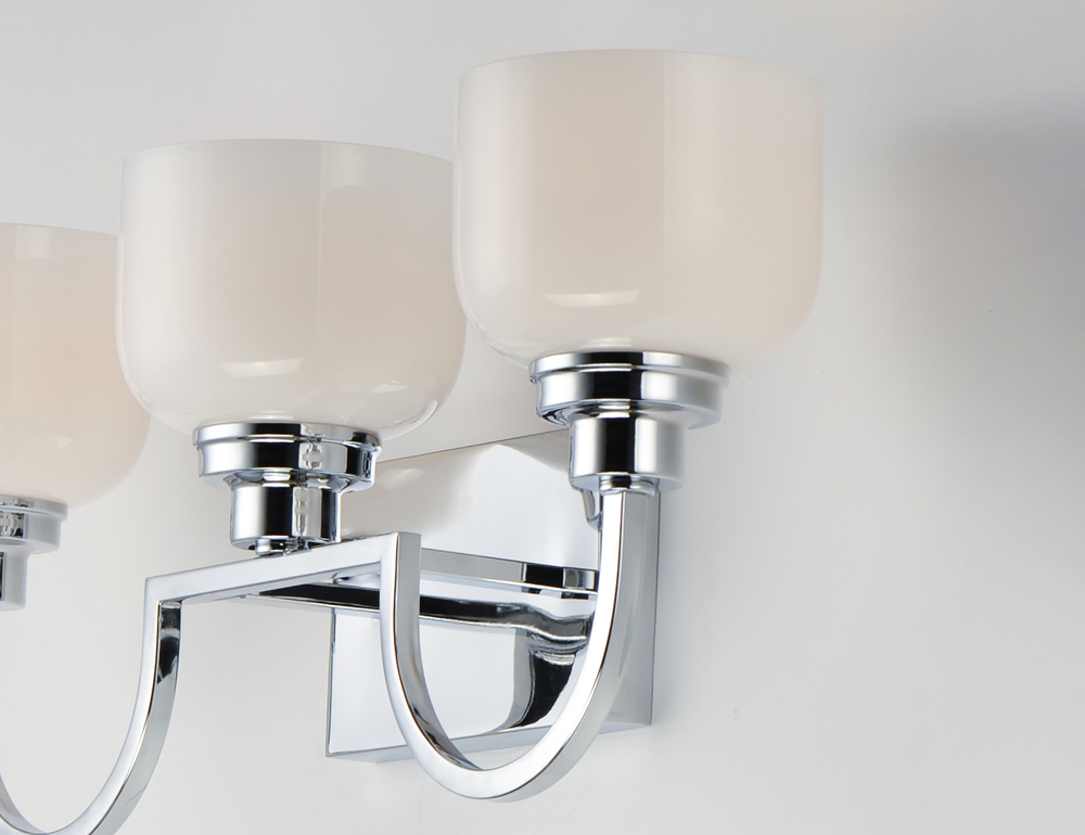 Square tube arms curve to form arcs of Polished Chrome in an interesting and unique fashion. White opal glass shades complete this clean design and provide a soft even illumination. Can be installed up or down.
