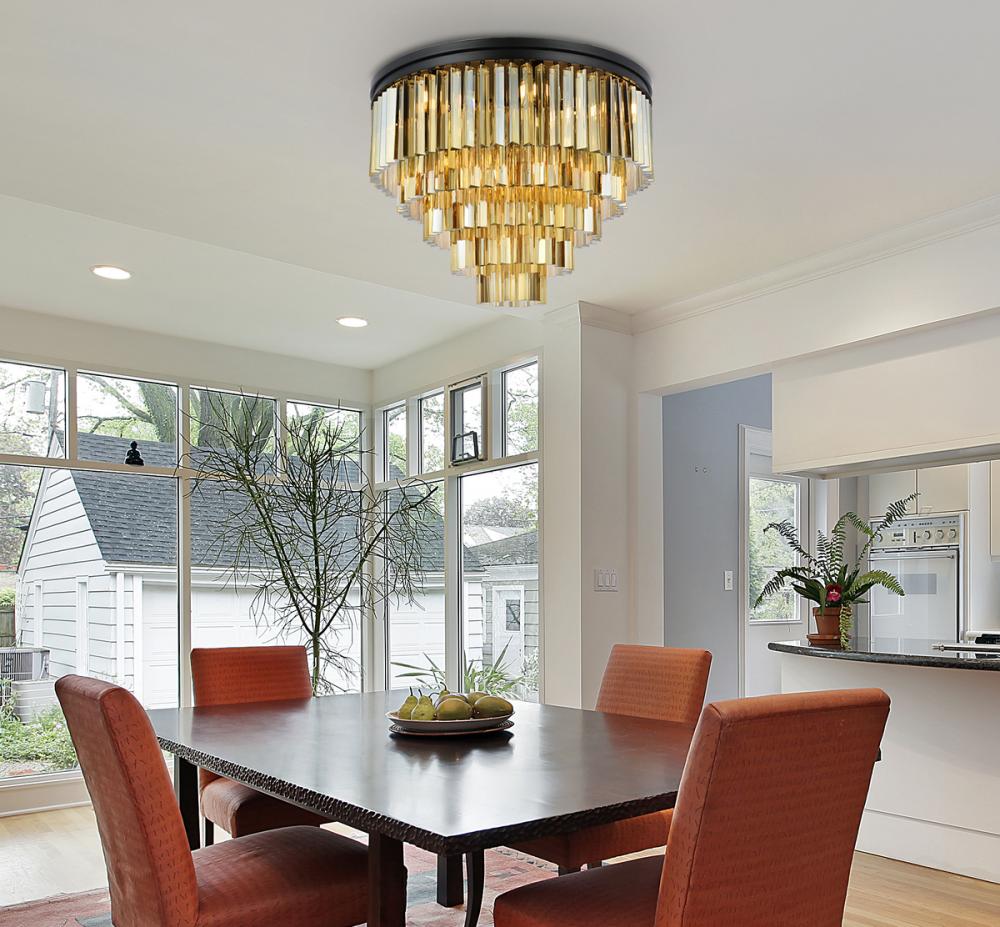 Timeless splendor and modern refinement are brought together in flush-mount Sydney fixtures. Dazzling in dining rooms, staircases, or hallways, the Sydney collection flaunts stunning tiers of royal-cut crystals in clear, golden teak, or Silver shade. A circular Matte Black or polished-nickel finished steel frame adds understated charm to this stunning flush-mount lamp.
