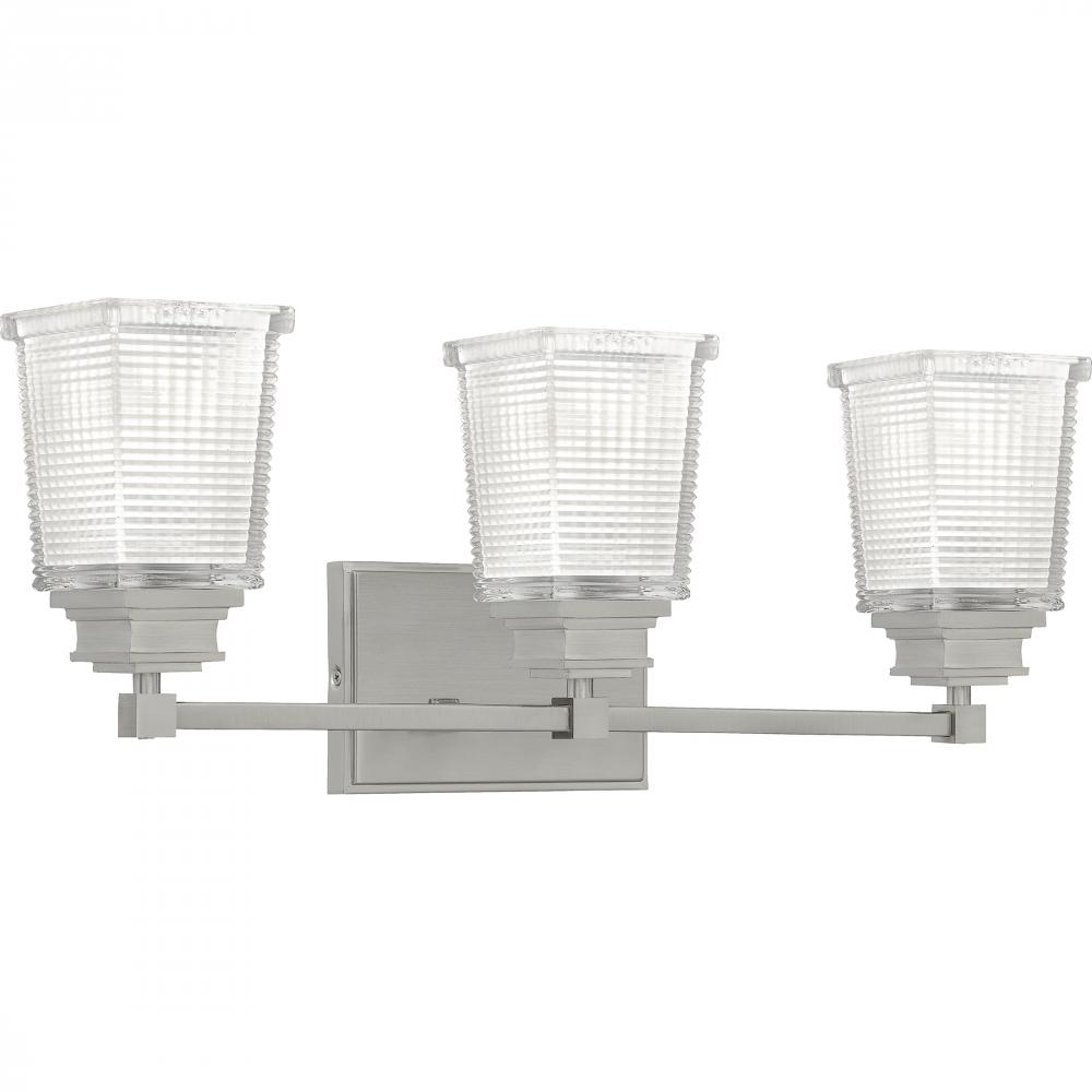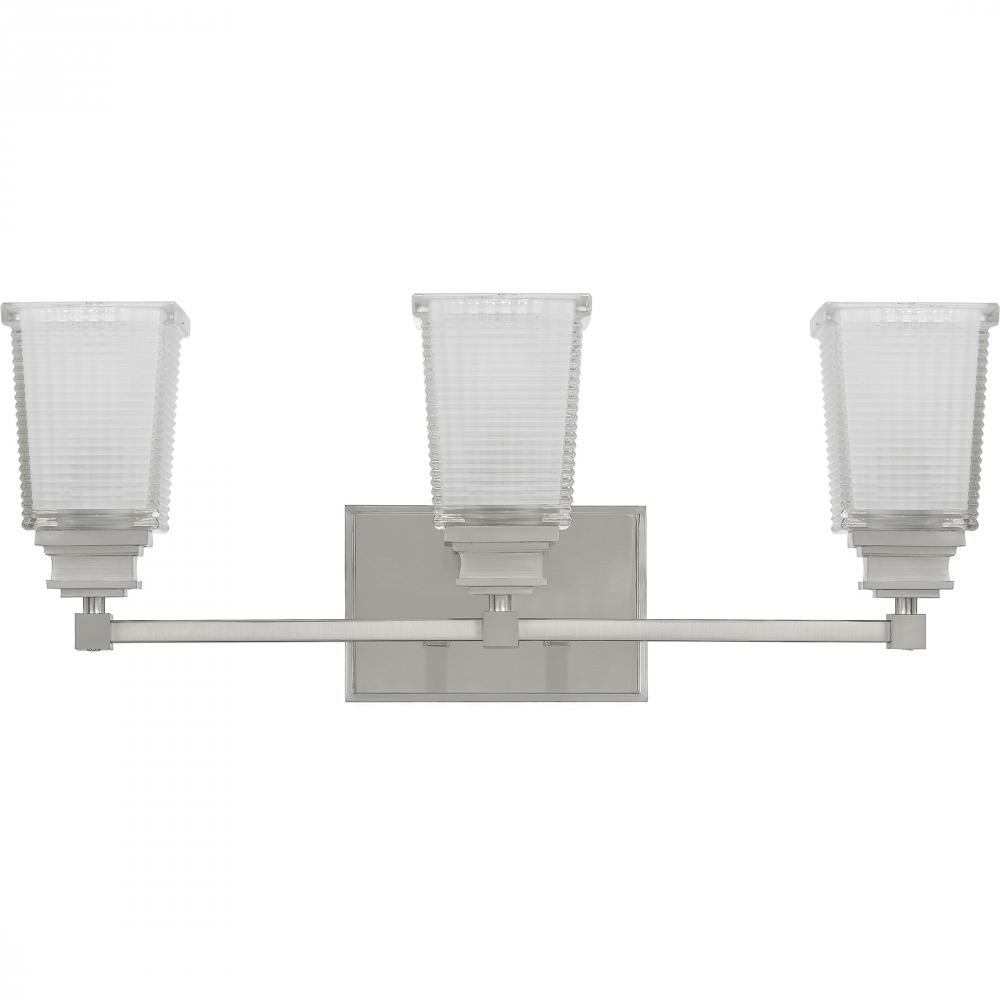 The transitional style of the Abbott collection is the perfect addition to any bathroom. Tiered cast fitters add just the right amount of detail. A Brushed Nickel finish with clear prismatic etched glass shades create a clean and simple fixture.