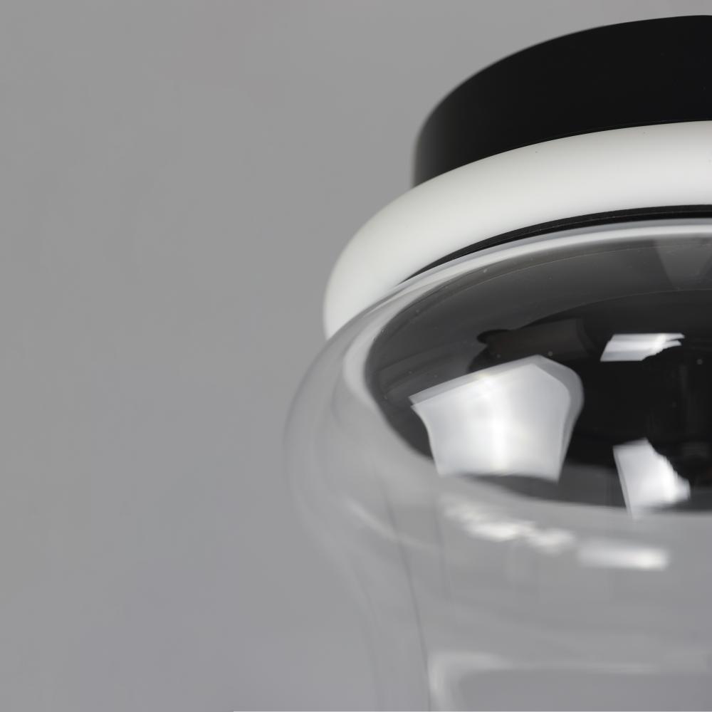 Segmented by bright LED rings finished in Matte Black, glass shades of an hourglass shape are combined into various configurations. The hand-blown glass is entirely transparent and varies in size creating an undulating pattern. All together, the series inc