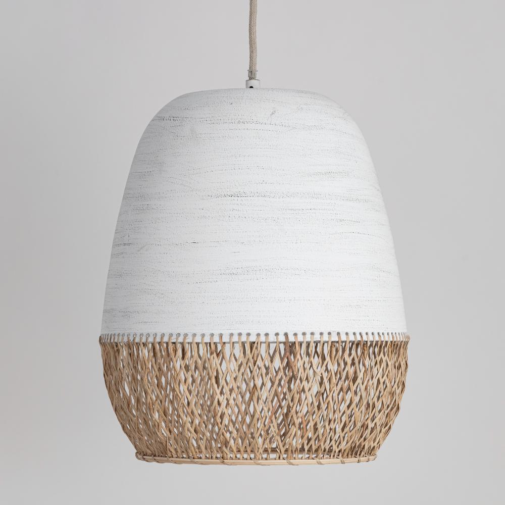 Earthy elegance takes shape in Tamba. A softly tapered metal shade is hand-finished in Rustic Ivory, each brushstroke revealing a subtle patina that feels timeworn yet refined. Below, handwoven rattan adds natural texture and warmth, casting a dappled glow