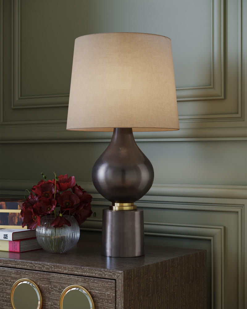 The Tamerlane Table Lamp has an elongated body that looks like a sophisticated trophy shape. Made of aluminum, the geometrical sections are covered in a mix of black nickel and vintage brass finishes. The contrasting brass is perfectly placed in the two rings cinching the body where the tall disc meets the vase shape and the finial.