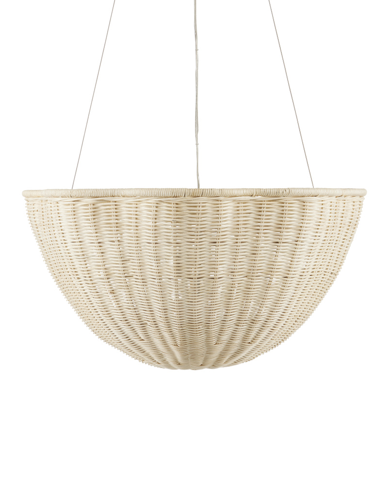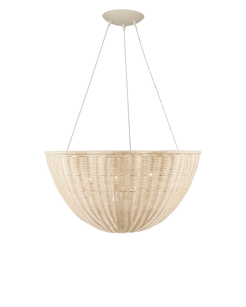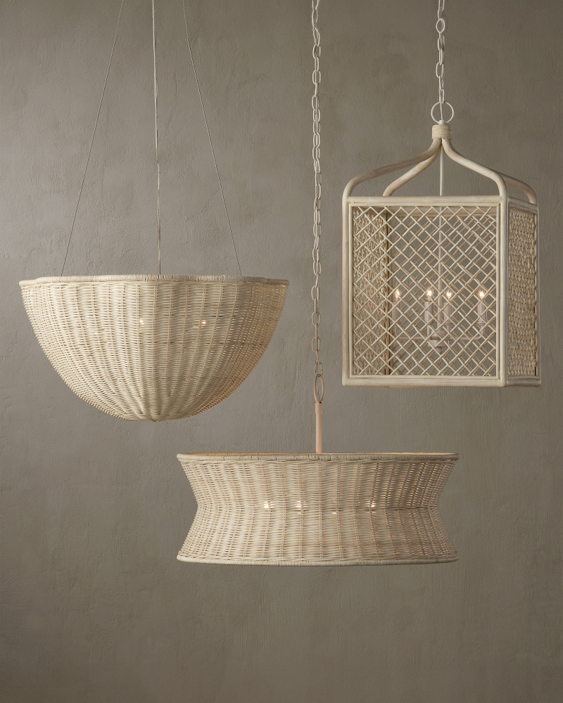 The Telos Pendant is made of wicker that has been bleached for a lighter feel. The beige pendant is perfect for spaces where an abundance of uplight is needed. The wicker pendant with its bowl-shaped profile is scalloped, though this is not obvious when viewed from the side. Given the nature of the woven natural material, pinpoints of light will waft through in spots. Adjustable from 28" to 128" with use of included chain/rod kit/cable. If your space calls for a longer drop, additional chain/rods/cable is available for purchase.
