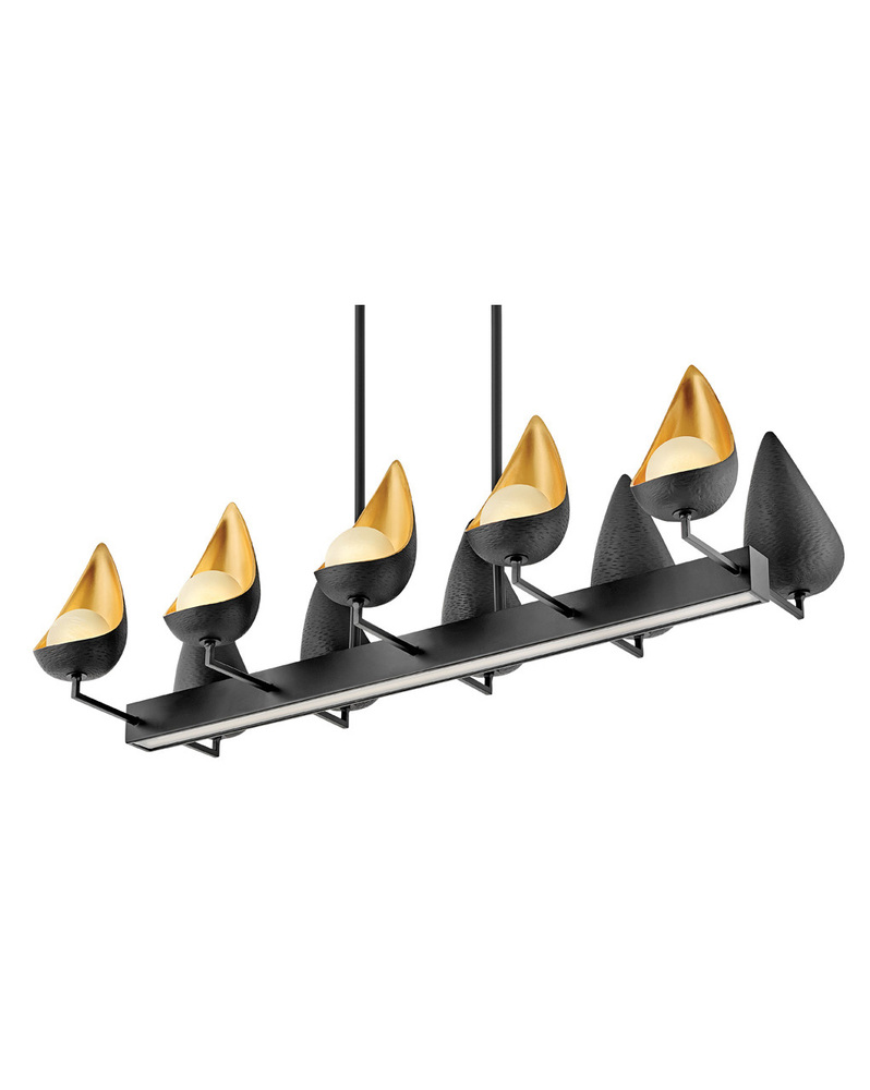 This collection draws inspiration from a simple found object; now reinterpreted with a post-modern aesthetic. The striking matte black pods with tantalizing interiors of luminous gold cradle a glowing globe of light to create a stunning statement.