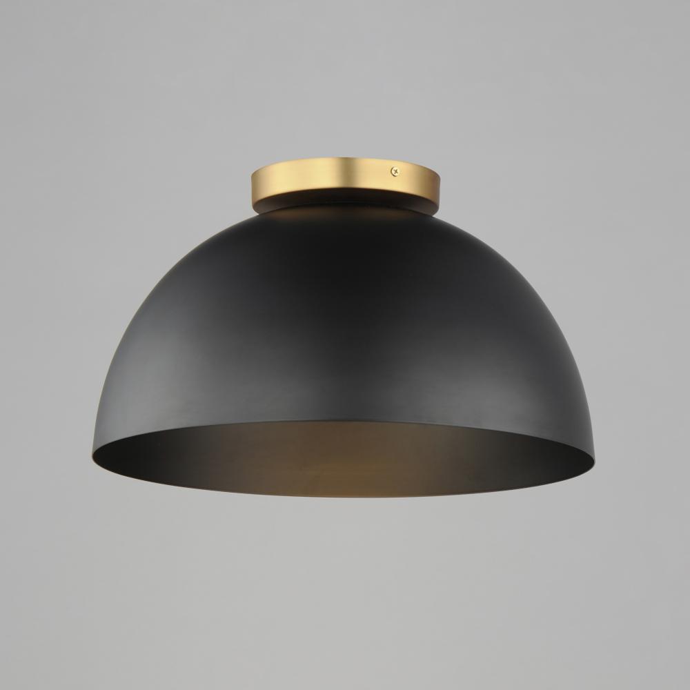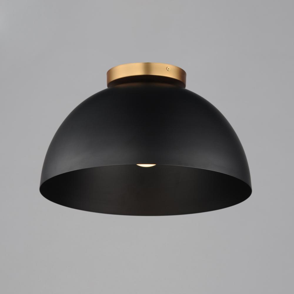 Dome shaped shades in Matte Black contrast Natural Aged Brass accents. Available in flush mount, bath vanity, and swing arm wall sconce configurations. This collection delivers an approachable, modern design that pairs well with transitional design aesthet