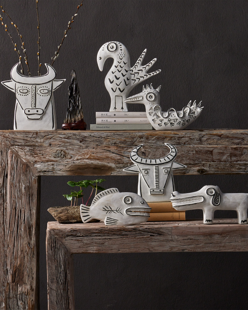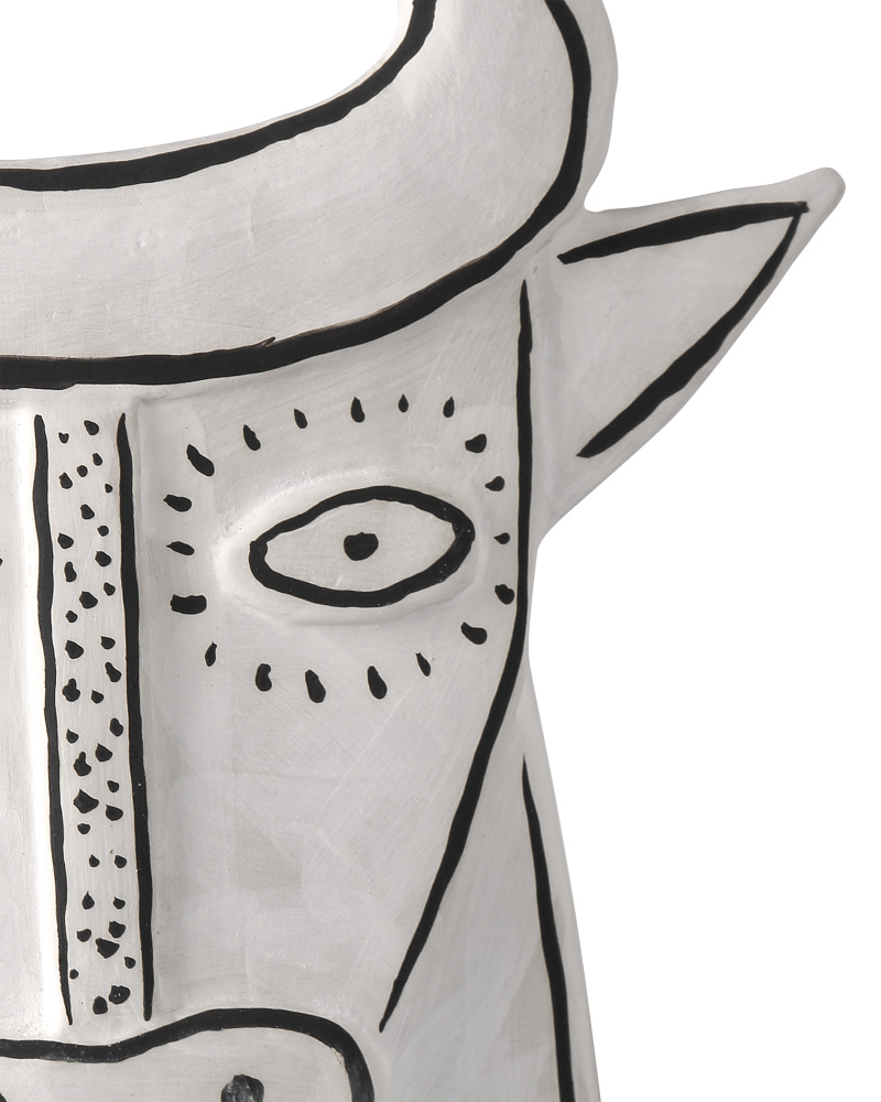 Artist Xiang Yang, a brilliant ceramist, took a walk on the wild side when he created Thomas the Bull. Made of porcelain in a washed-white finish with black whimsical details painted by the artist, the haunting vessel will create a stir not unlike Picasso's work did during his ceramics period as he experimented in the South of France.