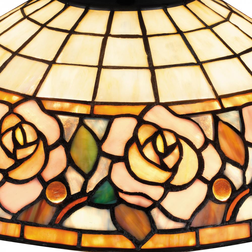 Bettys delicate, rose motif makes a pretty statement with multicolor art glass. The table lamp includes two pull chains and a classic, simple base finished in matte black. The Tiffany glass shade is hand crafted and hand assembled, creating a one-of-a-kind