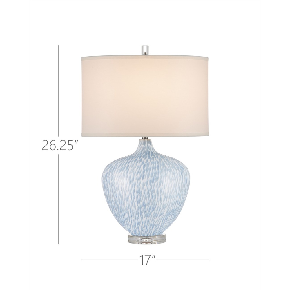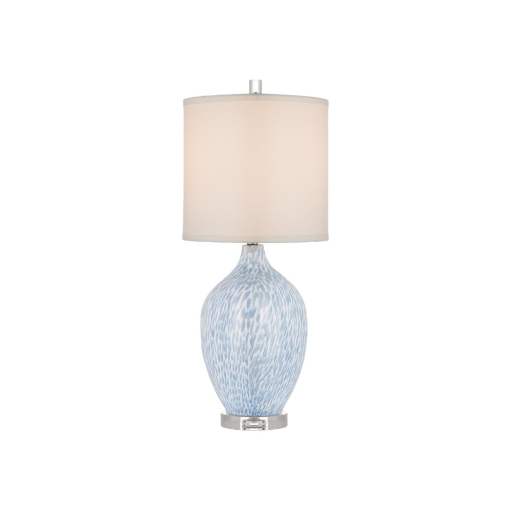 The Tinney Blue Table Lamp is a heart-shaped oval lamp with a feminine profile made of ceramic with a white ground on which pale blue shapes have been brushed to resemble flowing plumage. The graceful piece is topped with a self-trim drum shade fastened in place by an optic crystal finial that matches the optic crystal base. This is a great choice for a narrow console or side table.