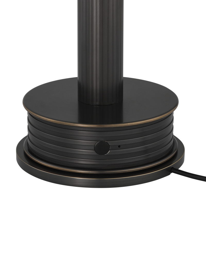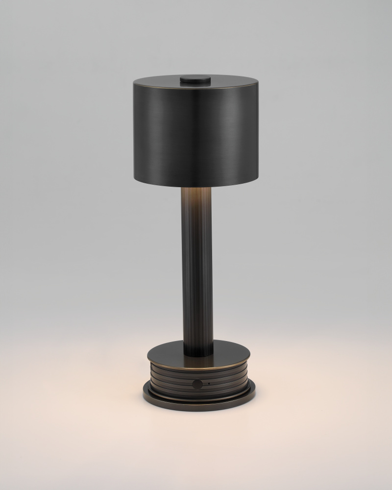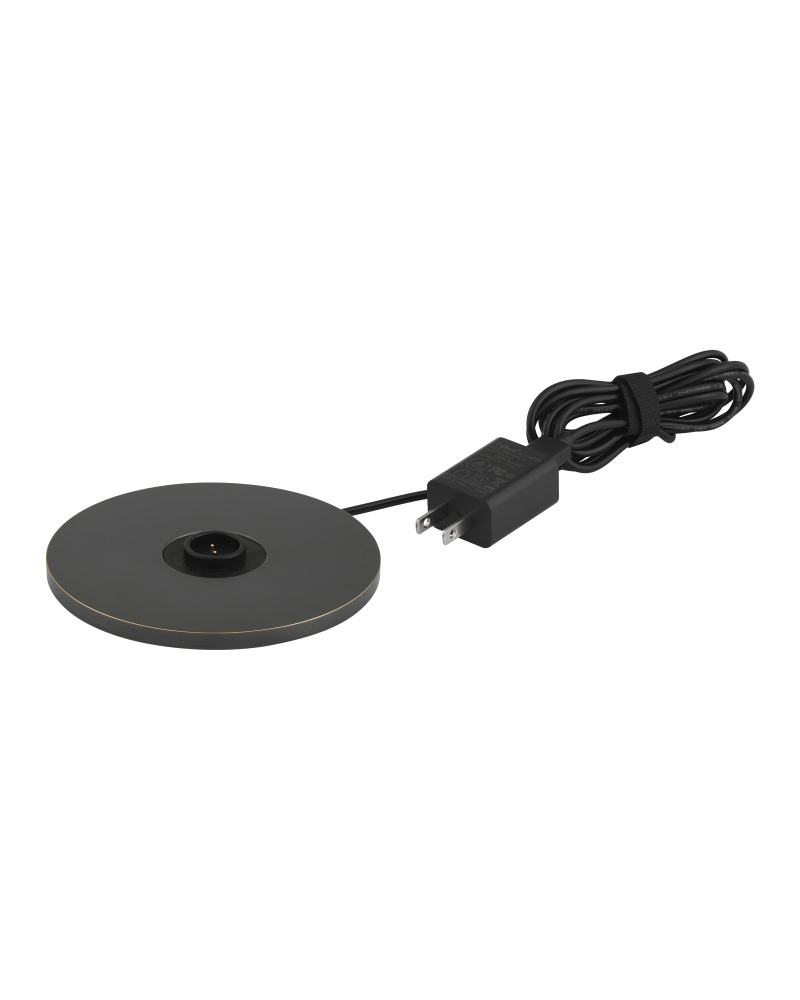 The Traverse Bronze Cordless Table Lamp is a black lamp that has a way of getting around. The metal lamp in an oil-rubbed bronze finish is petite in size, and its base holds the on/off switch. The matching metal shade has the same deep warmth as the rest of it. to recharge, simply place the lamp on its separate charging pad.