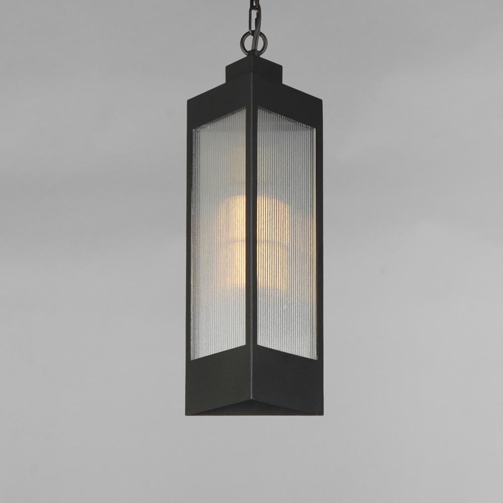 A transitional design suitable for both modern and more traditional applications, this outdoor series of lighting features Clear Ribbed glass that refracts the light source within triangular frames. A Black frame with warm Antique Brass light clusters with