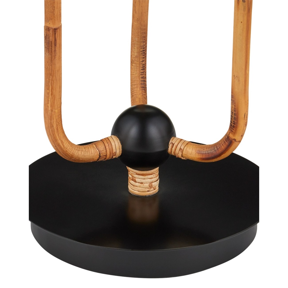 The three stems of the Triptych Floor Lamp that flow up from the satin black base are covered in natural rattan until they disappear under the black fabric shades. There are a number of special attributes to this design: the combination of black and neutral tones, and the cascading effect of the three shades as their supports grow shorter. These design details make the rope-wrapped floor lamp a stylish choice for a room. A foot switch enhances easy off and on maneuvering even if the floor lamp is tucked behind a piece of furniture.