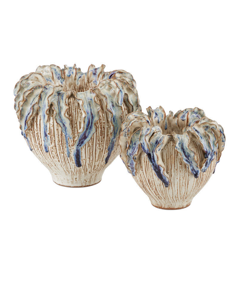 The Tropical Crown Small Vase is made of ceramic glazed in a mix of ivory and reactive blue. The leaves of the ivory vase that form the ruffles are done by hand using the pain-staking pinch method by a group of women artisans. Then the reactive blue glazing is dripped on them in an artisanal flourish.