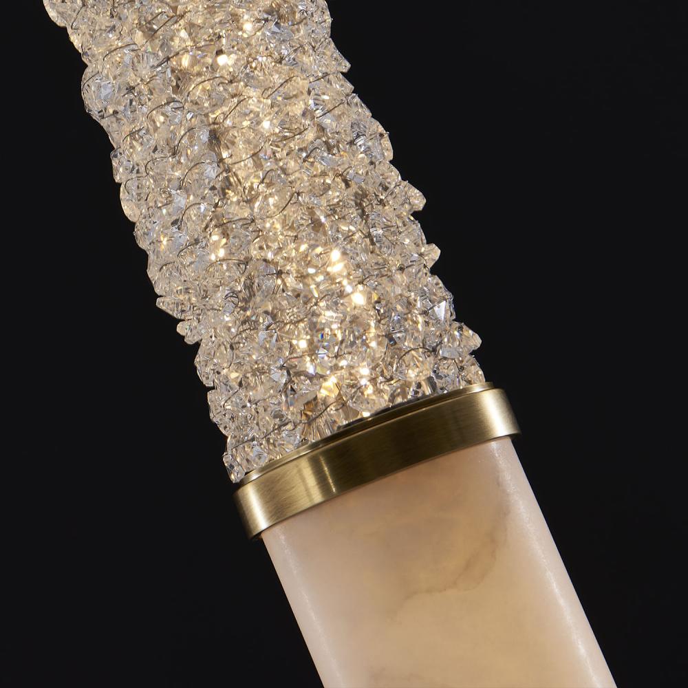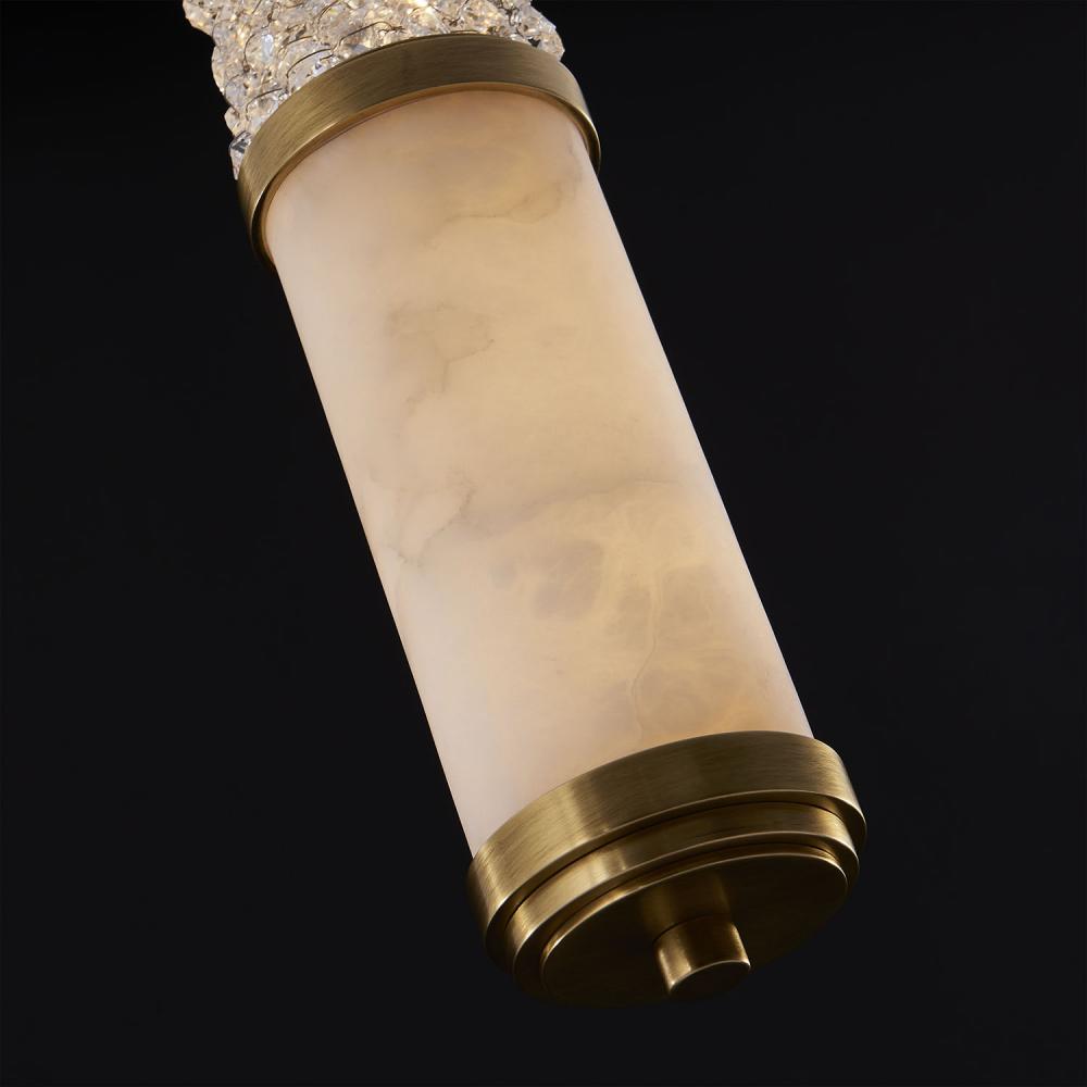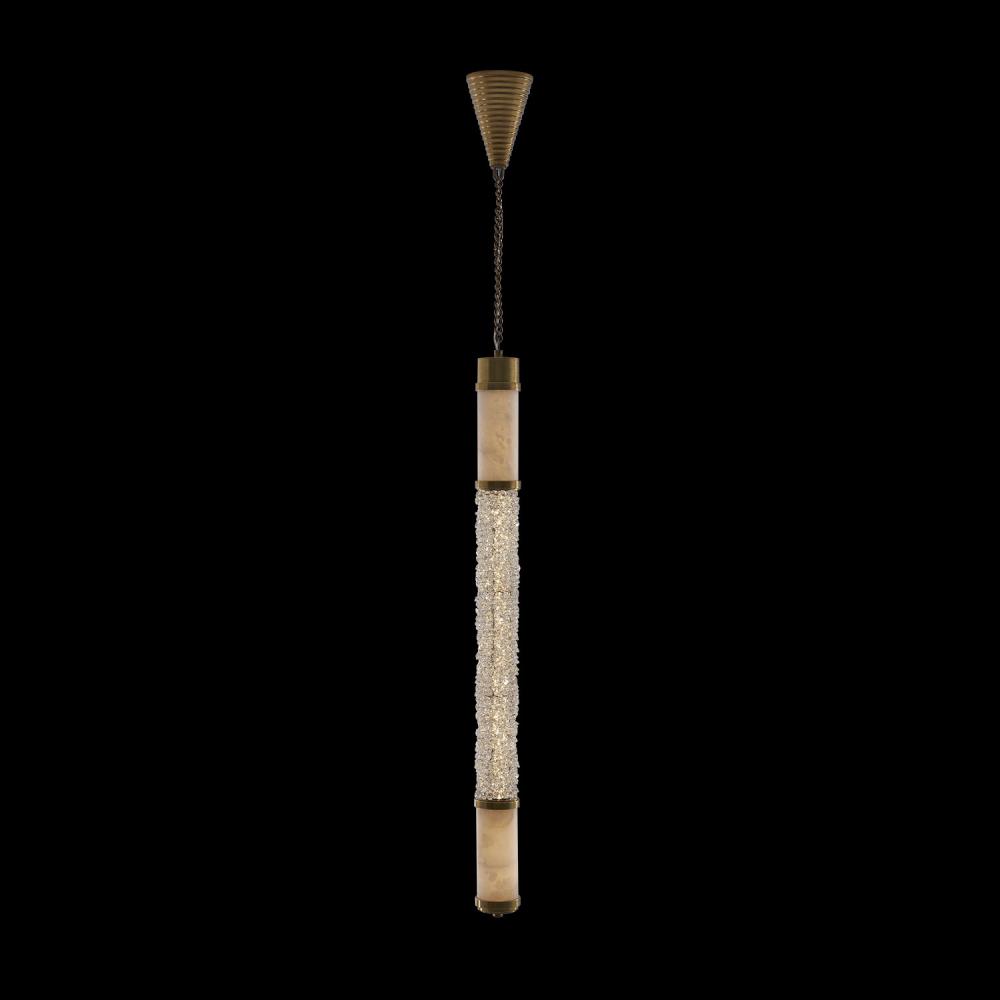 The Tubo features the layering of natural materials such as Alabaster, brass, and crystals to create complex beautiful textures that play with light. Add natural luxury to your living space with these Art Deco linear pendants that are offered in a Natural Brass finish and integrated LED lamping.