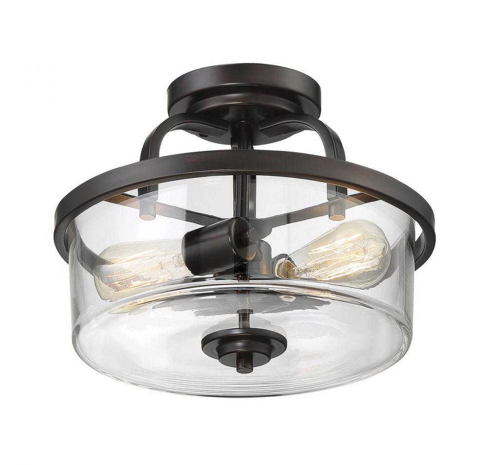 The Savoy House Tulsa ceiling fixture has sleek, casual style with a touch of an industrial-inspired aesthetic. Wide bands form a open, arched frame with a ring-shaped shade holder, streamlined finial and circular ceiling plate. This frame has a solid, understated practicality and a rich dark English bronze finish. The drum-shaped shade is made of pristine clear glass, allowing two 60W standard size bulbs to illuminate the area. Using visible filament or Edison bulbs will add to the vintage, utilitarian appeal. The fixture measures 12.75" wide, 10" high and has a semi-flush mounting that makes it a superb size to put comfortable, industrial chic style in your dining room, kitchen, living room, foyer, family room, office, bedroom or great room.