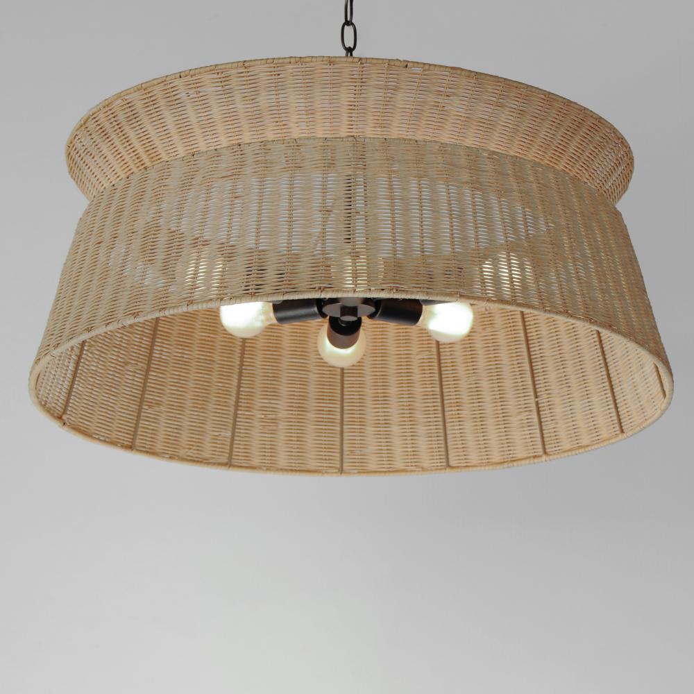 Hand-woven rattan wicker in a natural or darkened finish are shaped into a sloping drum shade with an internal fan and LED light source within them. The contrasting Dark Bronze finish of the metalwork encases an LED ring toward the bottom edge of the shade