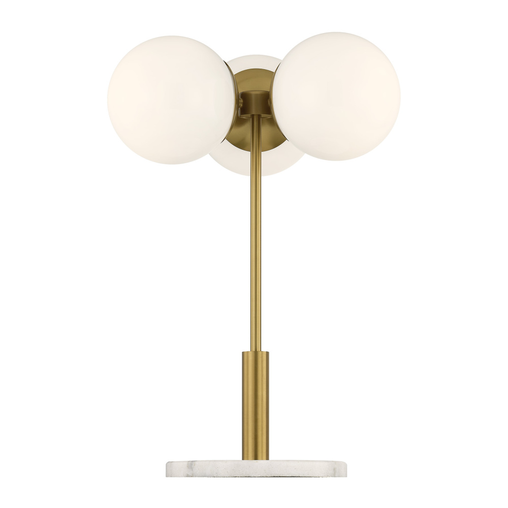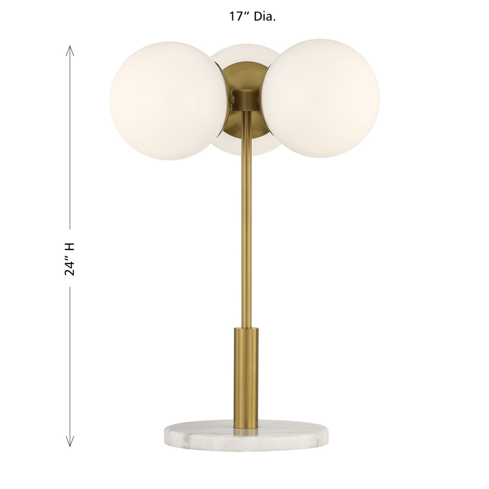 The Savoy House Turin 3-light table lamp, designed by award-winning designer Dann Foley, channels timeless mid-century modern poise. Smooth opal glass globes float gracefully above a genuine marble base, creating a sculptural silhouette that feels both iconic and current. Finished in Warm Brass, Turin casts a welcoming light while adding instant design credibility to your space. Turin is 24" in height and 17" in width. It uses three standard size bulbs of up to 60 watts per bulb. Bulbs not included.