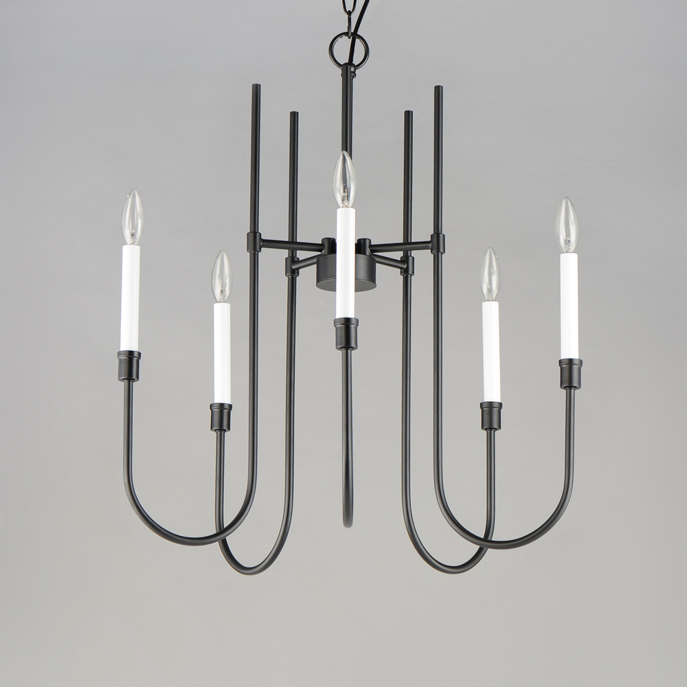 Updating the traditional chandelier form, the Tux collection uses elongated sweeping lines evocative of the mid-20th century and stripped down ornamentation to create a transitional lighting product relevant again. The two-tone Black and White powder coate