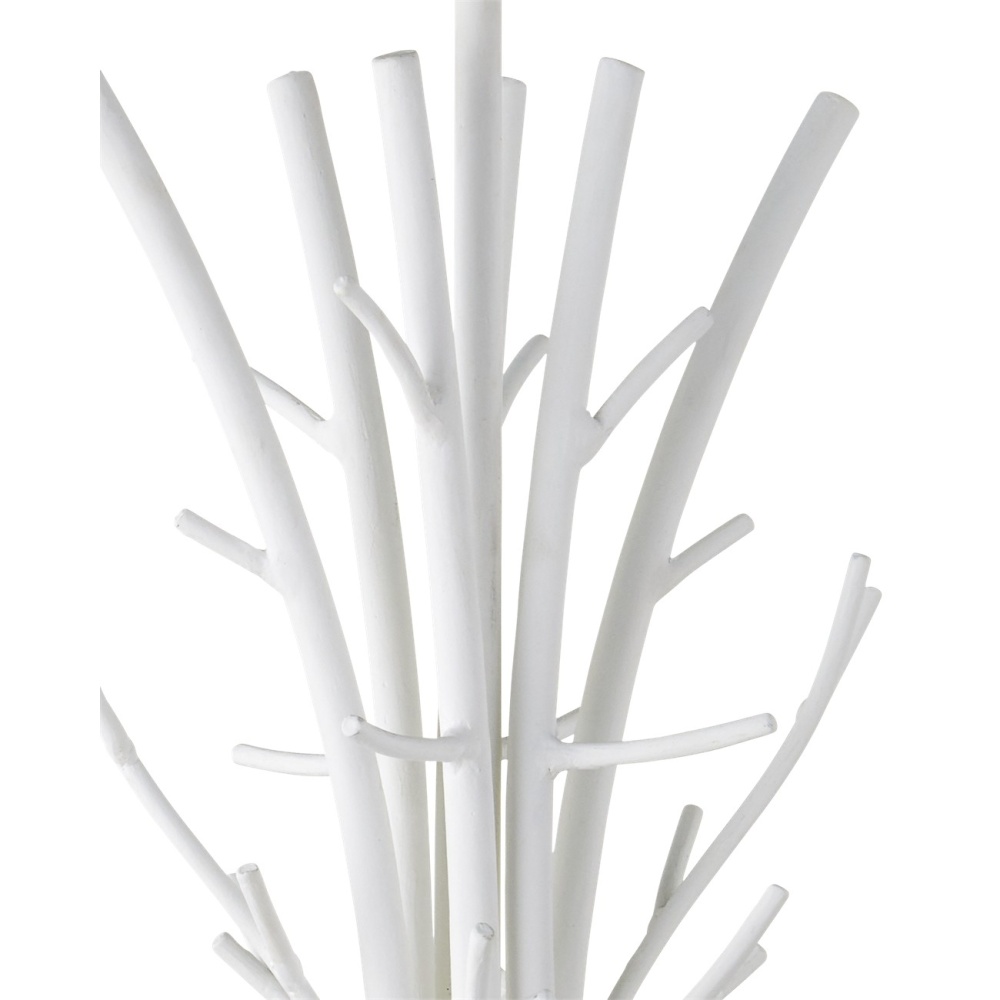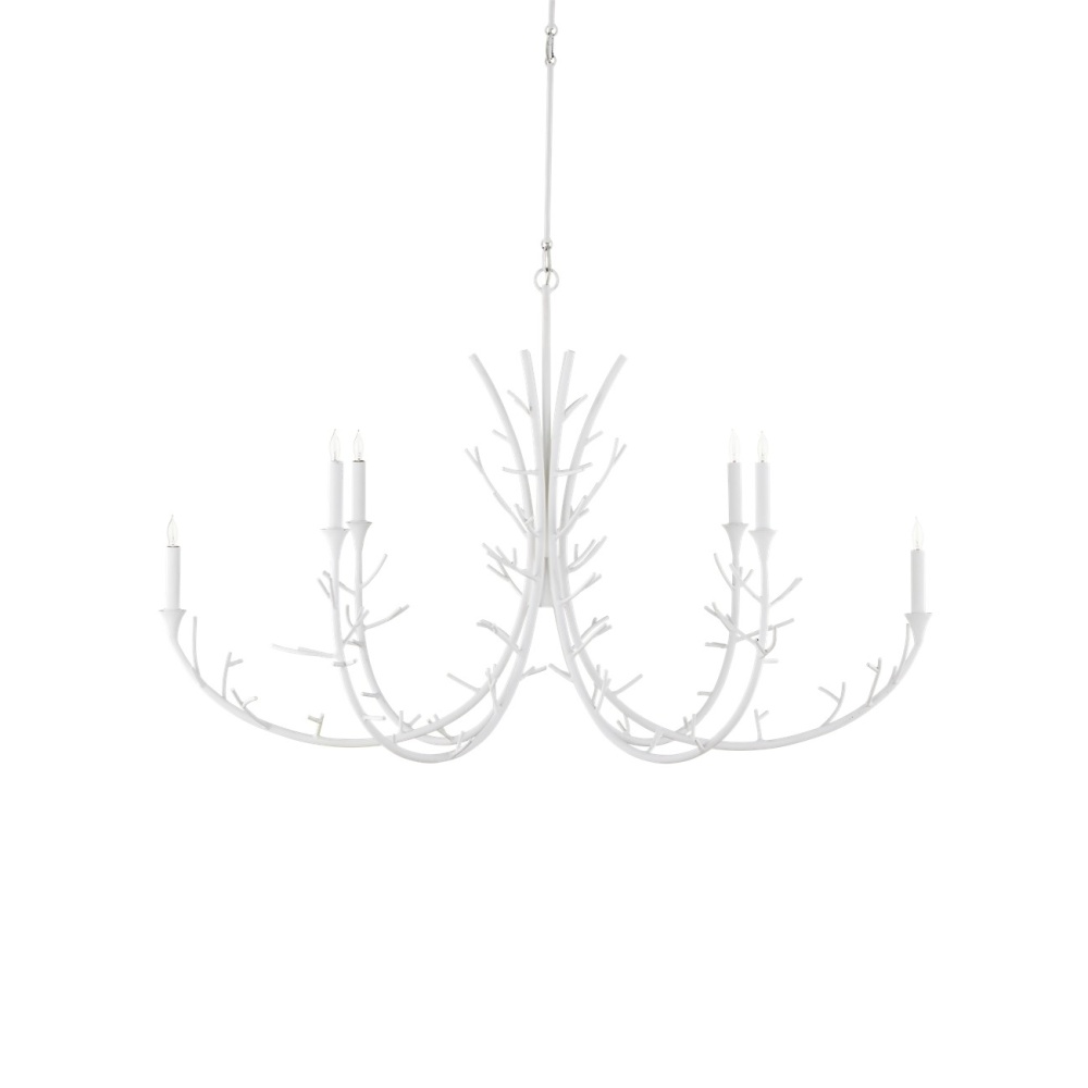 The Twiggy Oval Chandelier draws inspiration from snowy landscapes, with arcing limbs ornamented with spiky twigs. The design aims to capture the way snow collects on the leafless branches of trees, creating a visually striking and evocative piece. The gesso white wrought iron design is oblong, making it ideal for illuminating rectangular dining room tables or long kitchen islands. Adjustable from 47.5" to 112.5" with use of included chain/rod kit/cable. If your space calls for a longer drop, additional chain/rods/cable is available for purchase.