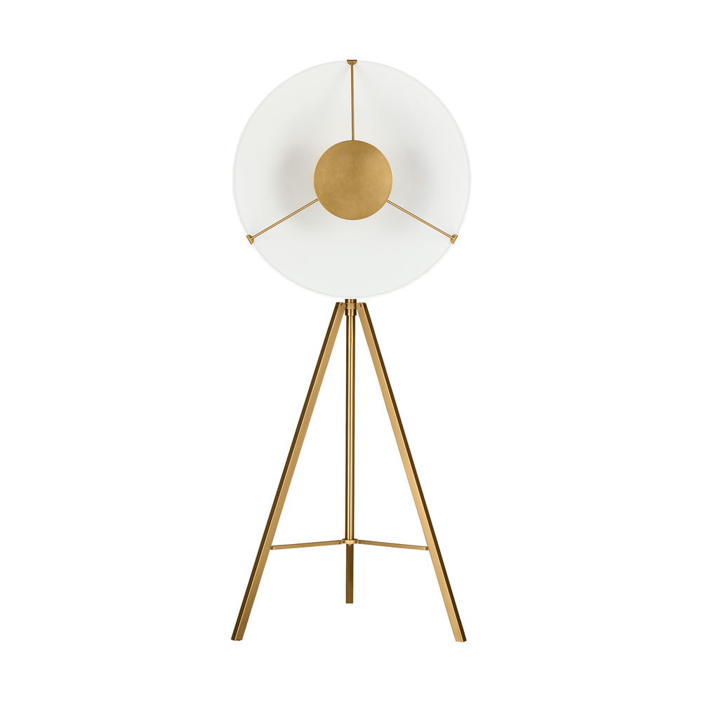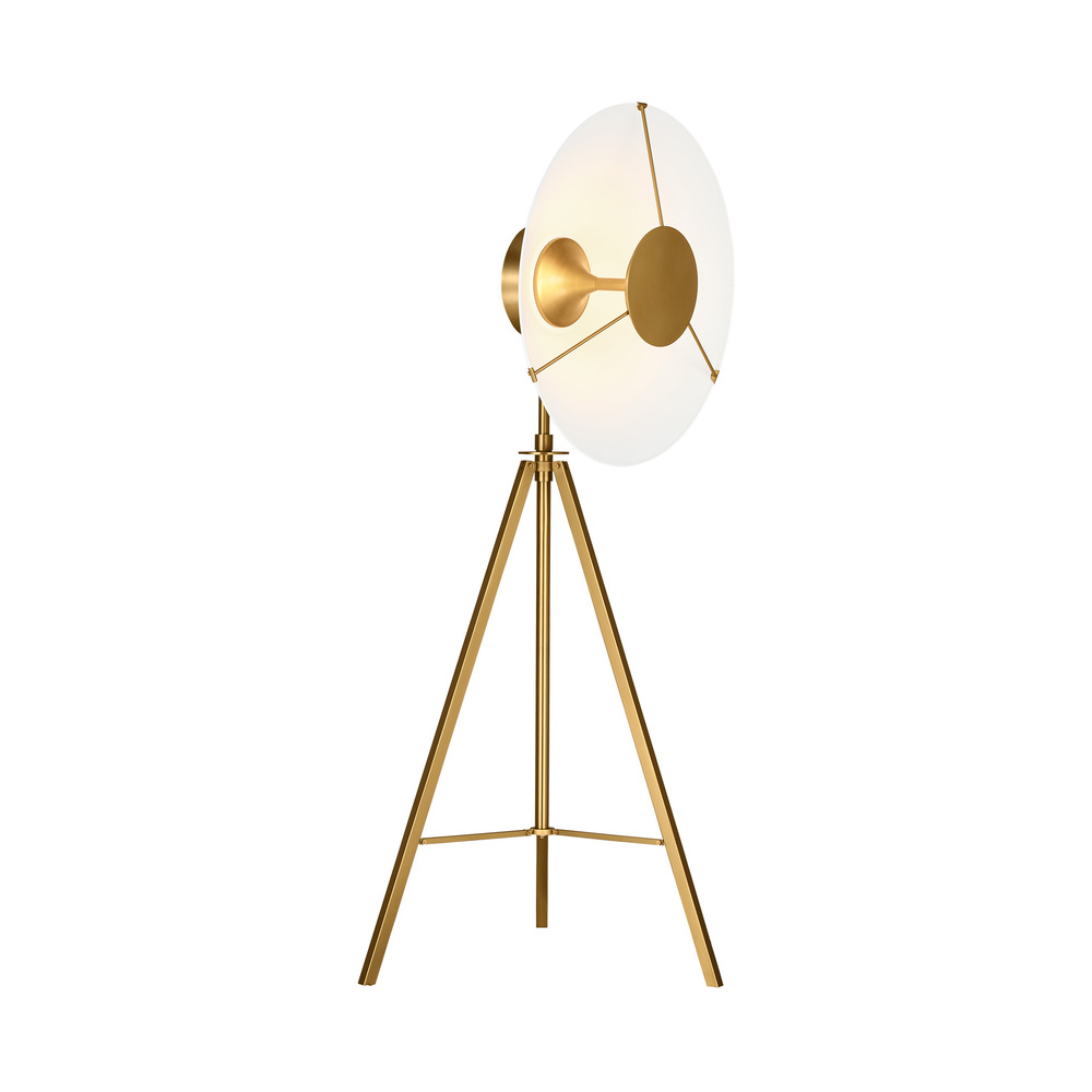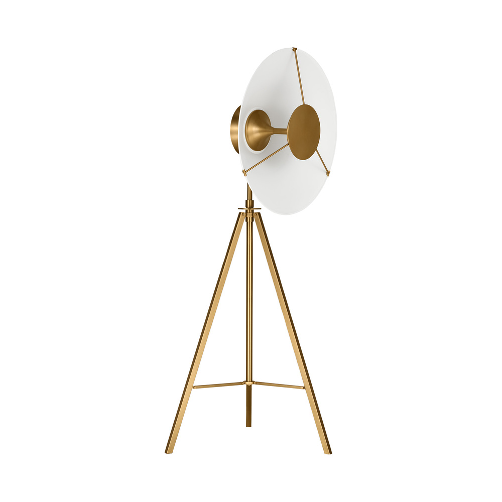 The Ultra Light one light floor lamp by Chapman & Myers makes a statement in any space with its flared conical shade and brass hardware. The seamless spun metal shades were designed to cast a soft indirect light from a hidden LED panel behind its central suspended brass disc. The reflecting shade is finished Matte White which is contrasted against the Burnished Brass trim.