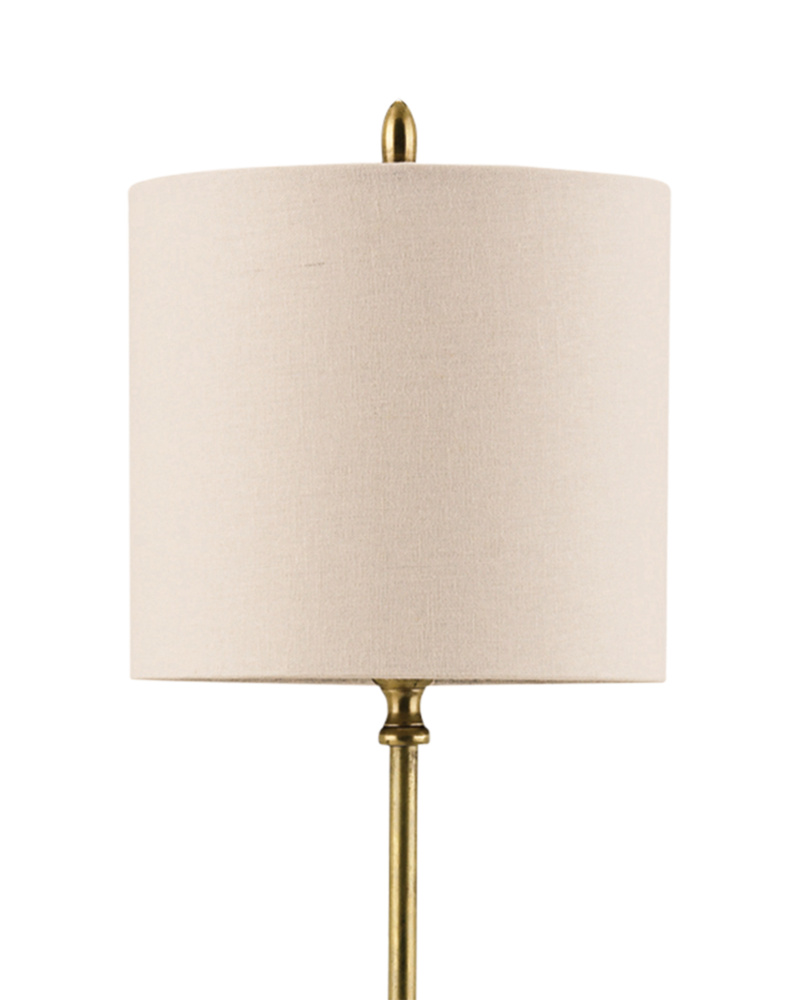 This yellow version of the Upbeat Table Lamp belongs to a series of luminaries that can only be called the mod squad with their kicky colors that harken back to the era of cool. Also available in teal, orange, white and gray, the shapely terracotta base has a center ball with expressive cones extending up toward an off-white linen shade and downward to its culmination. The shade is fastened with a wrought iron finial that matches its hardware and culminates the 31-inch tall profile of the lamp.