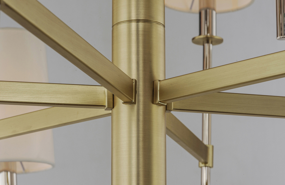 Elongated tails and candle sticks create effortless sophistication in the Uptown series. The slender candles of Polished Nickel contrast the stout supporting arms finished in a soft Satin Brass. Tall Off-White fabric shades complement the updated classic d